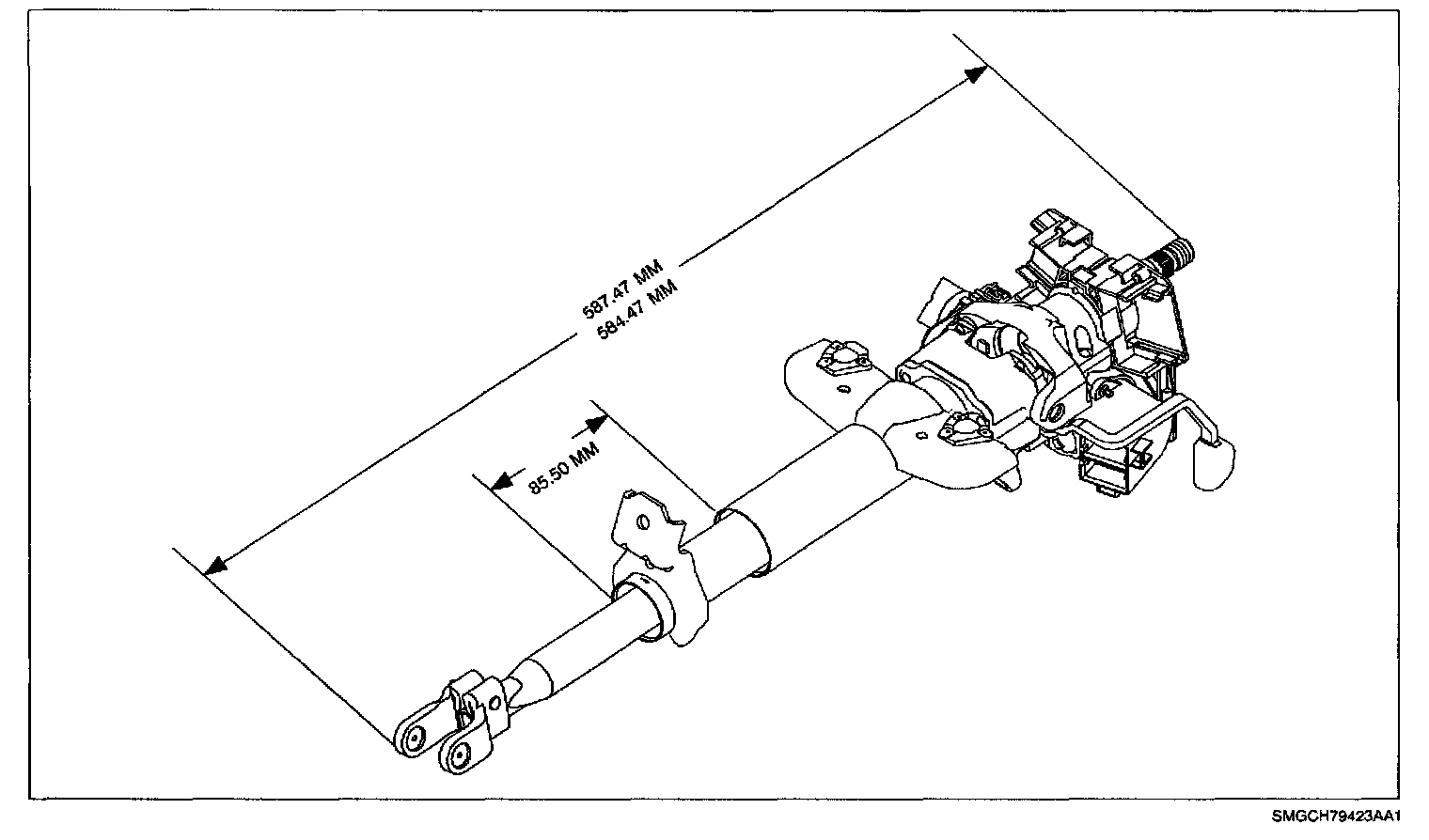 2. Check steering column jacket for collapse by measuring between the end of the bearing assembly and the lower edge of the upper bracket. If the dimension is less than 85.50 mm (3.37 in.), replace the jacket.