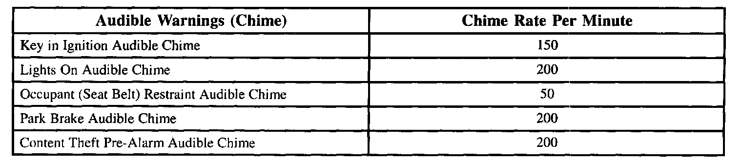 The BCM will provide an audible chime for park brake when the park brake is applied and the vehicle speed is higher than 3 mph. The chime rate for this feature is 200 chimes per minute.
