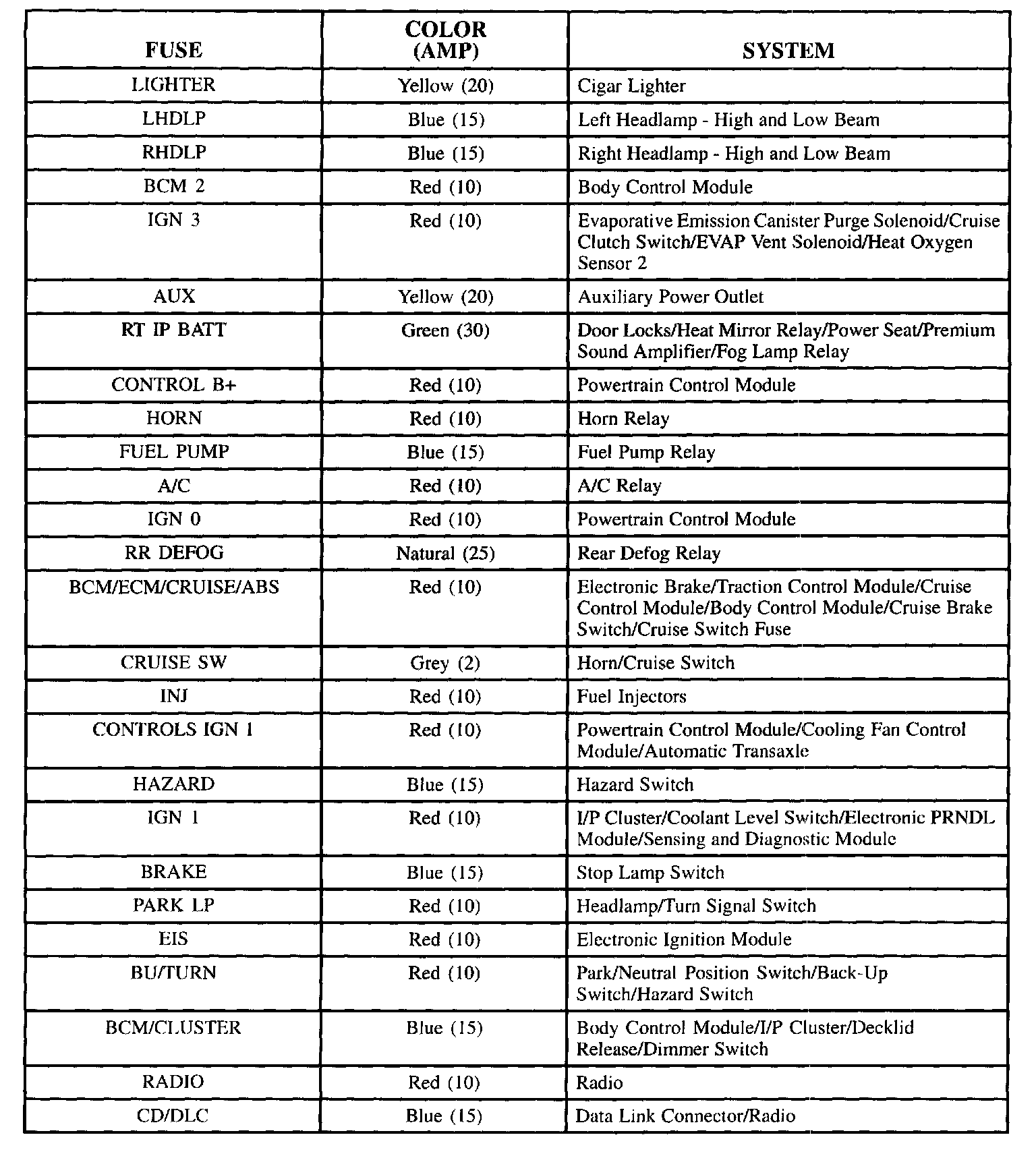 The chart lists the minifuses located in the underhood fuse block, and the circuits they feed
