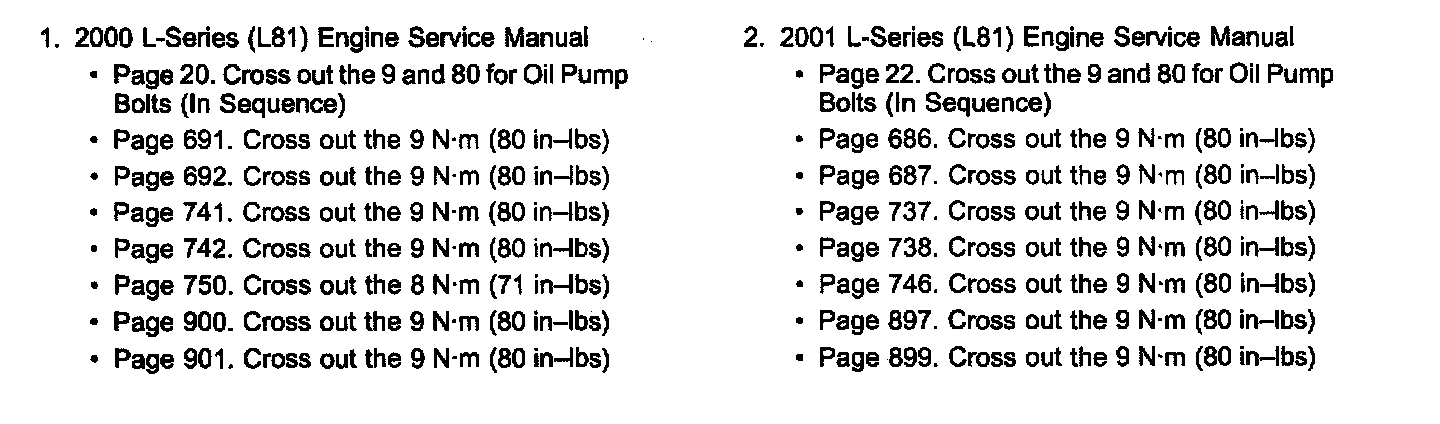 Service Manual and Quick Reference Specifications Guide Update for all 2000-2003 L81 Engine Regarding Incorrect Oil Pump Bolt Torque Specifications