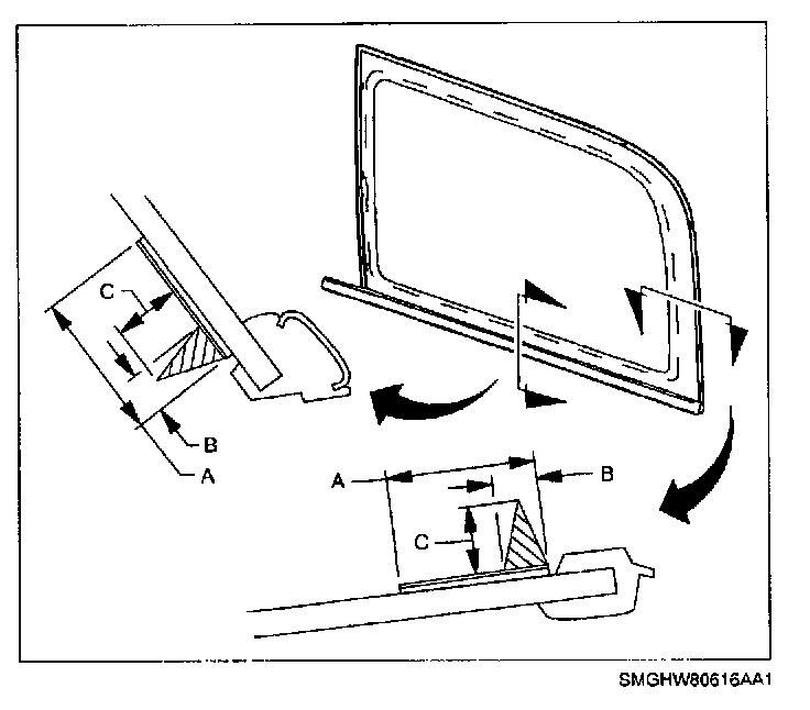 NOTE: Until the new urethane has cured, air pressure from a closing door may cause the quarter glass to move. To prevent this, lower the opposite side door window a minimum of 76 mm (3 in.) before closing the door.