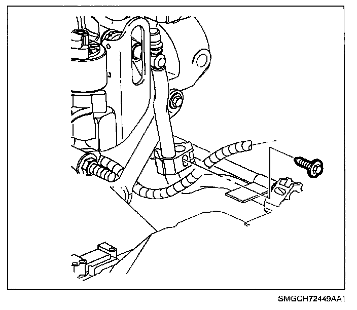 6. Remove screw from fuel line clip and disconnect fuel line from rail.