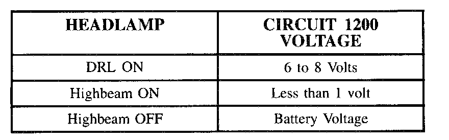 For DRL operation, the parking brake must be fully released, the ignition switch must be in the RUN position and headlamp switch must be in the Off position. On automatic transaxle vehicles the vehicle must be shifted out of Park to activate the DRL's. Under normal operating conditions, the feedback voltage to the BCM measured at circuit 1200 is: