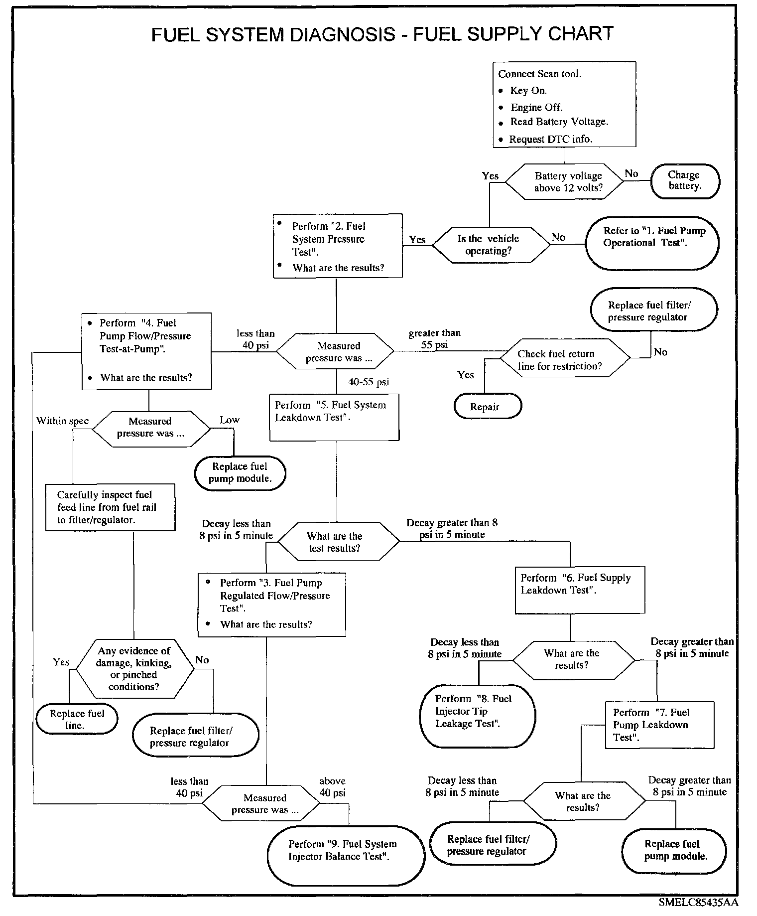 The fuel system tests outlined in the fuel system diagnostic flow chart and detailed procedures (Tests 1 - 9) provide a systematic approach to determining whether the fuel system, from fuel pump to fuel injectors, is functioning as intended.