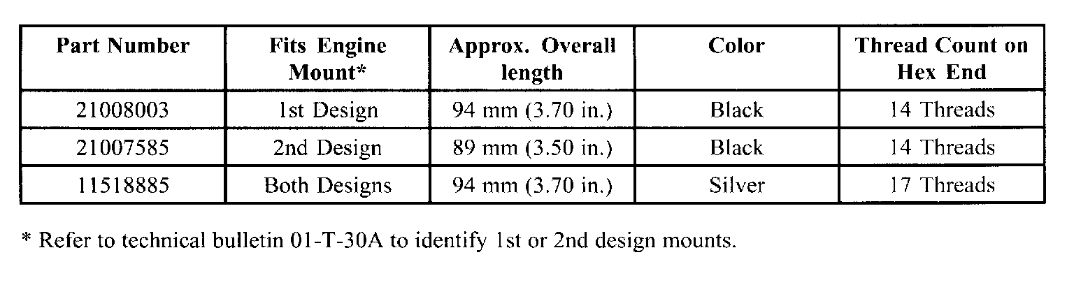 The purpose of this bulletin is to inform you about a new front cover engine mount stud that is now available which will fit both 1st and 2nd design engine mounts. The new stud has been increased in length to allow for more exposed threads when the engine mount is installed. The front cover engine mount stud P/N 11518885 is now available and replaces previously released front cover engine mount studs P/N 21008003 (1st design) and P/N 21007585 (2nd design) and can be used on either design front cover engine mount.