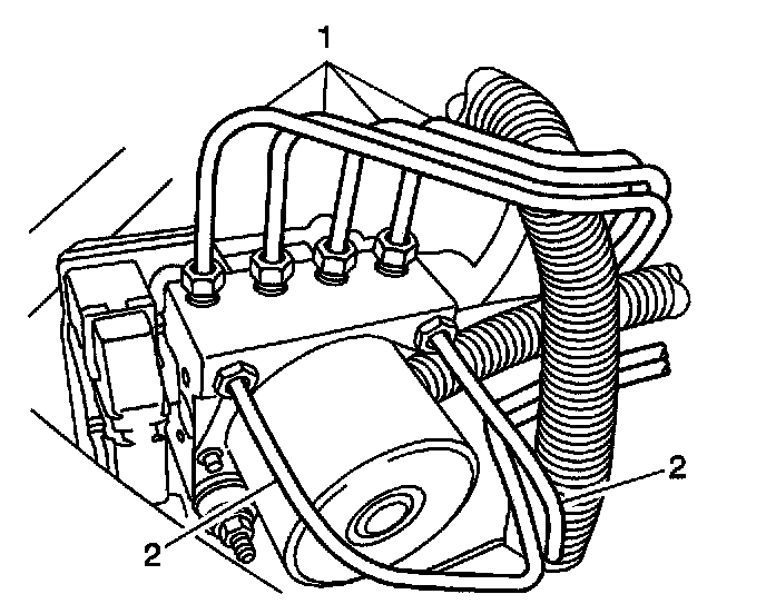 5. Connect the master cylinder brake pipes (2) to the modulator assembly, in the same location as removed.