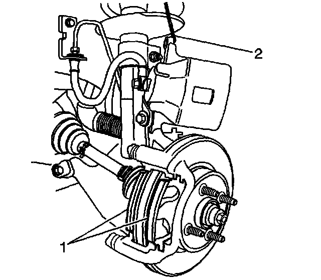 1. Remove the brake caliper from the brake caliper mounting bracket and support the brake caliper with heavy mechanic's wire (2), or equivalent. Do NOT disconnect the hydraulic brake flexible hose from the caliper.