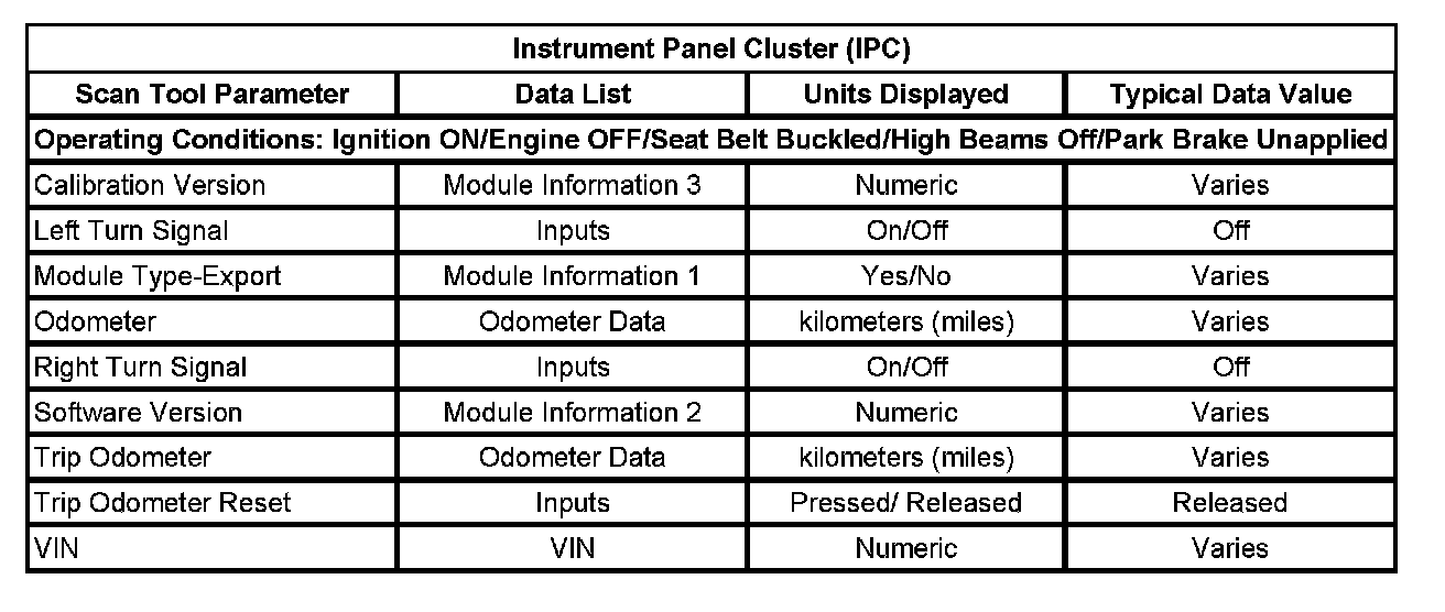 Scan Tool Data List - Instrument Panel Cluster (IPC)