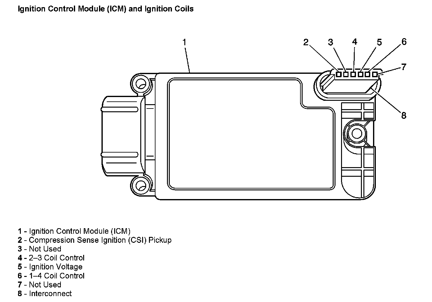 Each ignition coil supplies secondary voltage to a pair of spark plugs. This is called a waste spark ignition system. The engine control module (ECM) supplies a signal on each of the ignition control (IC) timing control circuits to the ignition control module (ICM). The ICM fires the correct ignition coil at the correct time based on the signals. The ICM detects if cylinder 1 or cylinder 3 is on the compression stroke by sensing the secondary voltage and polarity of each side of the ignition coil. The higher voltage is on the compressing cylinder. This is called compression sense ignition. The ICM provides a synthesized cam signal to the ECM based on these inputs. The ECM uses the cam signal to synchronize fuel injection. This system consists of the following circuits: