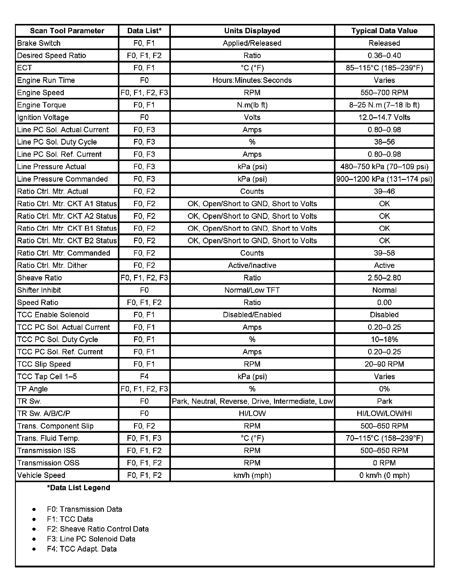 Only the parameters listed below are used in this service manual for diagnosing. If a scan tool displays other parameters, the values are not recommended by General Motors for use in diagnosis.