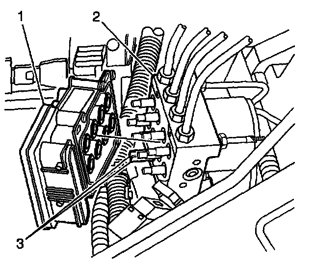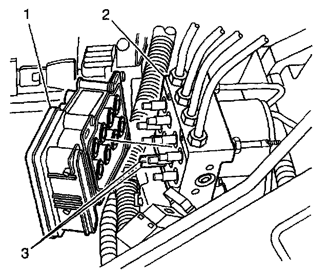 2. Install the EBCM (1) to the BPMV (2). Use care when aligning the EBCM (1) to the BPMV electrical terminals (3).