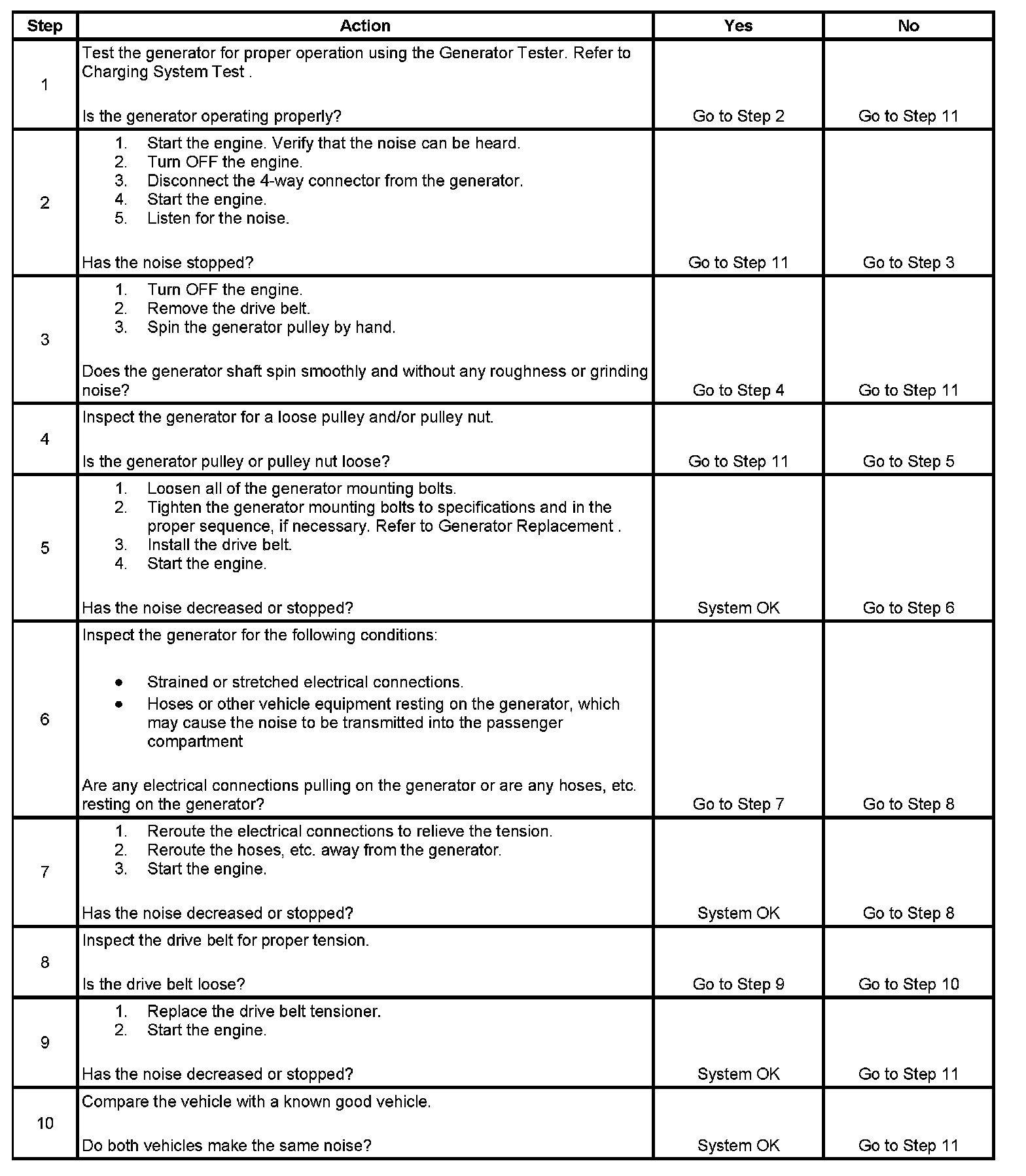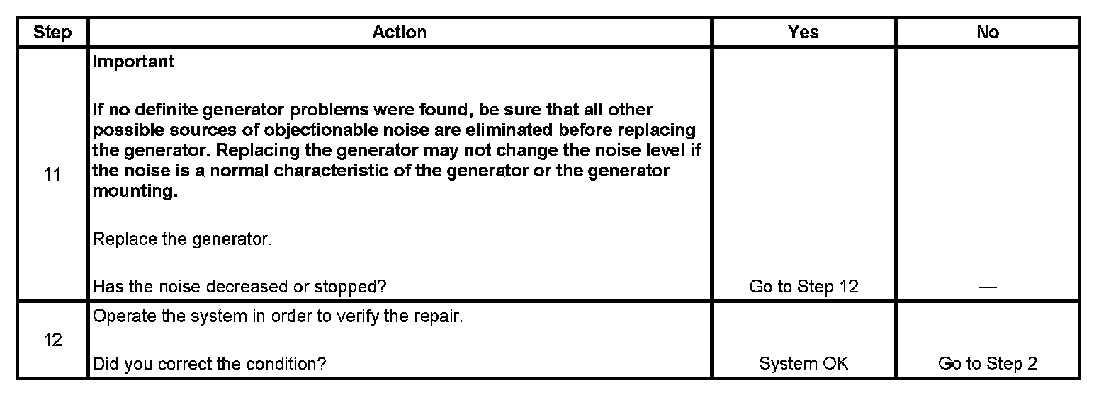 Noise from a generator may be due to electrical or mechanical noise. Electrical noise or magnetic whine usually varies with the electrical load placed on the generator and is a normal operating characteristic of all generators. When diagnosing a noisy generator, it is important to remember that loose or misaligned components around the generator may transmit the noise into the passenger compartment and that replacing the generator may not solve the problem.