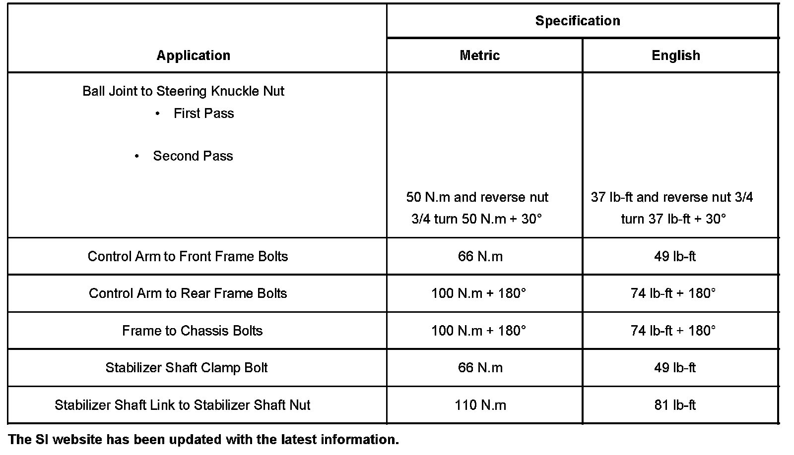 Please obtain all copies of the printed 2003, 2004, and 2005 Saturn ION Service Manual, Vol. 1, and write in the new values in the procedures in the Front Suspension section that are affected by these changes. Also print out copies of SI Document ID# 878679 and insert the new "Front Suspension Fastener Tightening Specifications" table in place of the existing "Front Suspension Fastener Tightening Specifications" table in each Service Manual.
