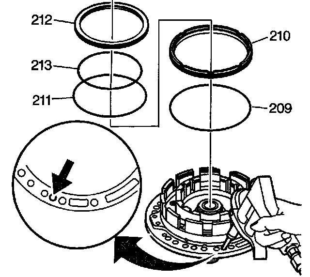 9. Remove the second clutch piston outer seal (209) from the second clutch piston (210).