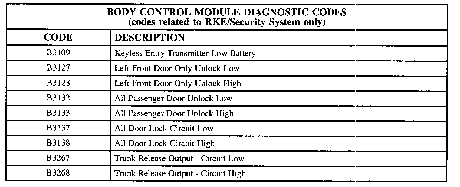 The table lists the body control module (BCM) diagnostic codes related to the RKE/security system: