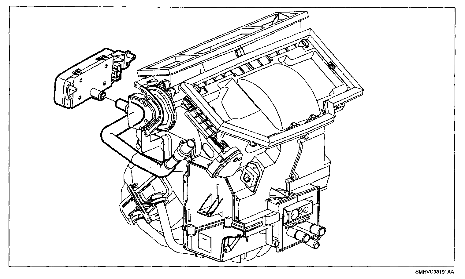 The HVAC module consists of a recirc actuator, a mode actuator, blower motor and fan, a temperature door actuator, a blower motor control module, a heater core, and an evaporator core. The operations of these assemblies are controlled by the knobs and switches on the HVAC control panel.