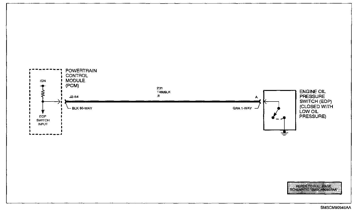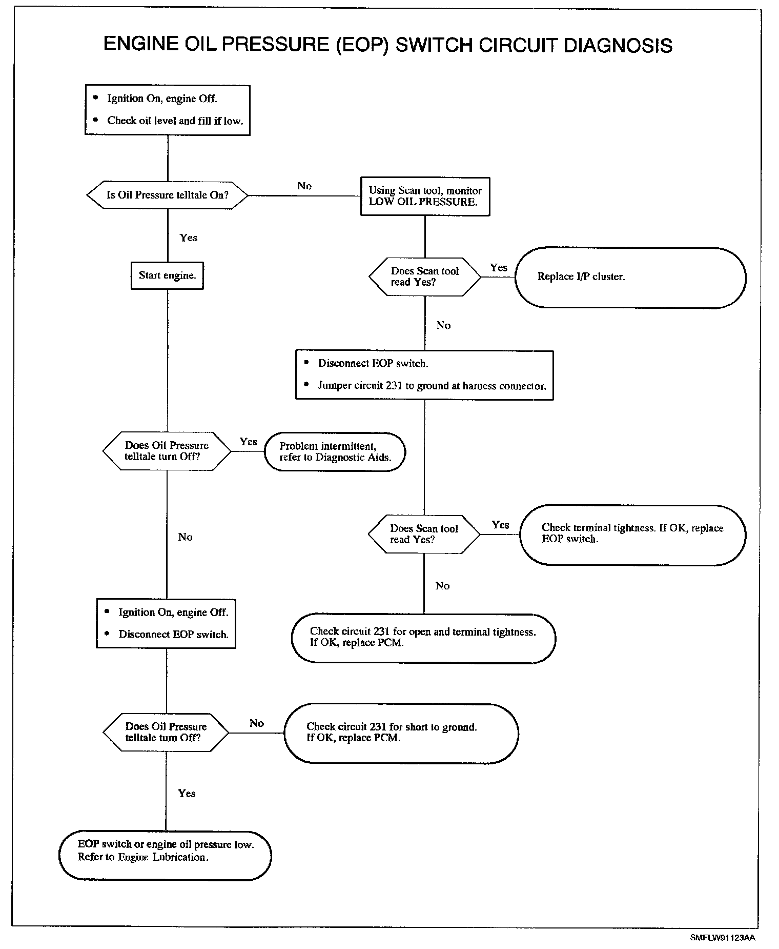 To locate an intermittent problem, use Scan tool to monitor LOW OIL PRESSURE while grounding and ungrounding circuit 231 at the EOP switch harness connector. The Scan tool should indicate YES when circuit 231 is grounded and NO when circuit 231 is NOT grounded.