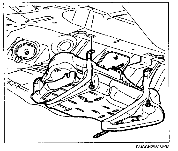 3. Reposition fuel tank mounting straps and shield around tank and install strap mounting bolts to underbody.