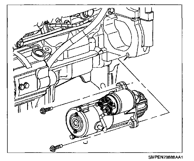 6. Remove lower starter assembly to engine block bolt.