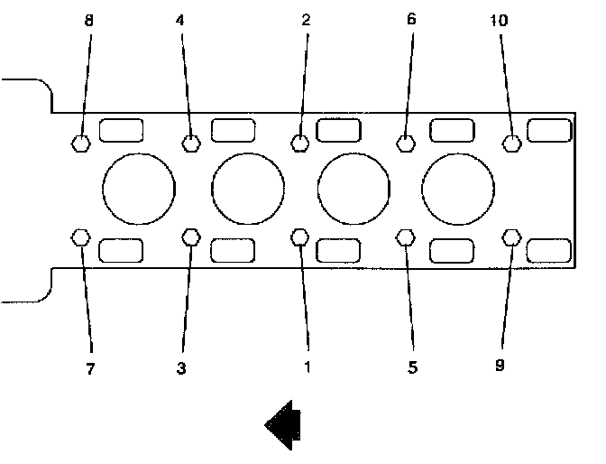 - Install exhaust manifold to cylinder head retaining nuts. Tighten nuts starting from the center and working outward.