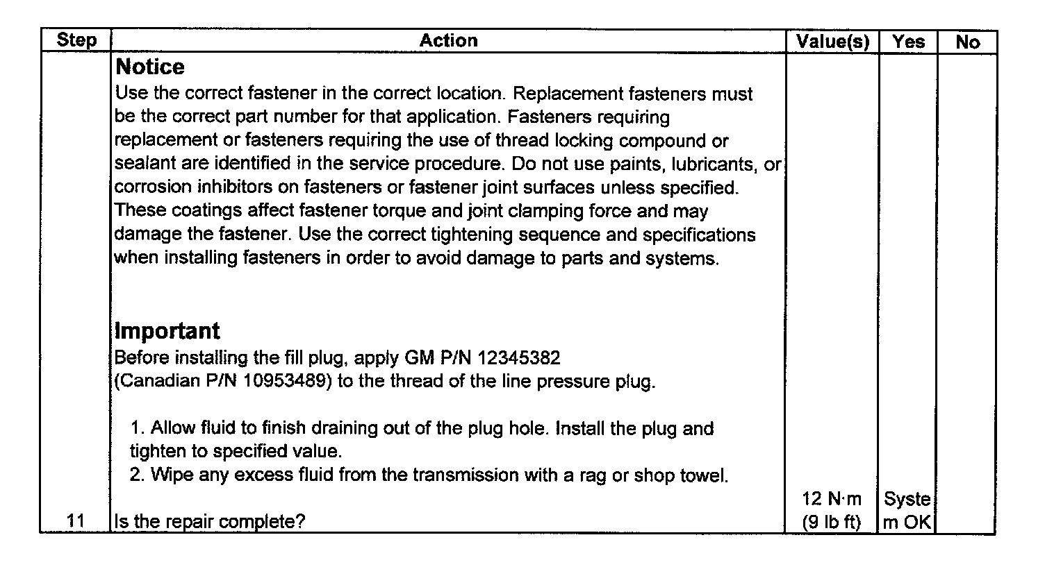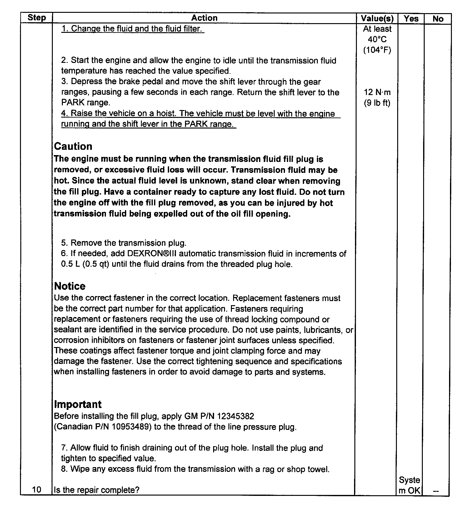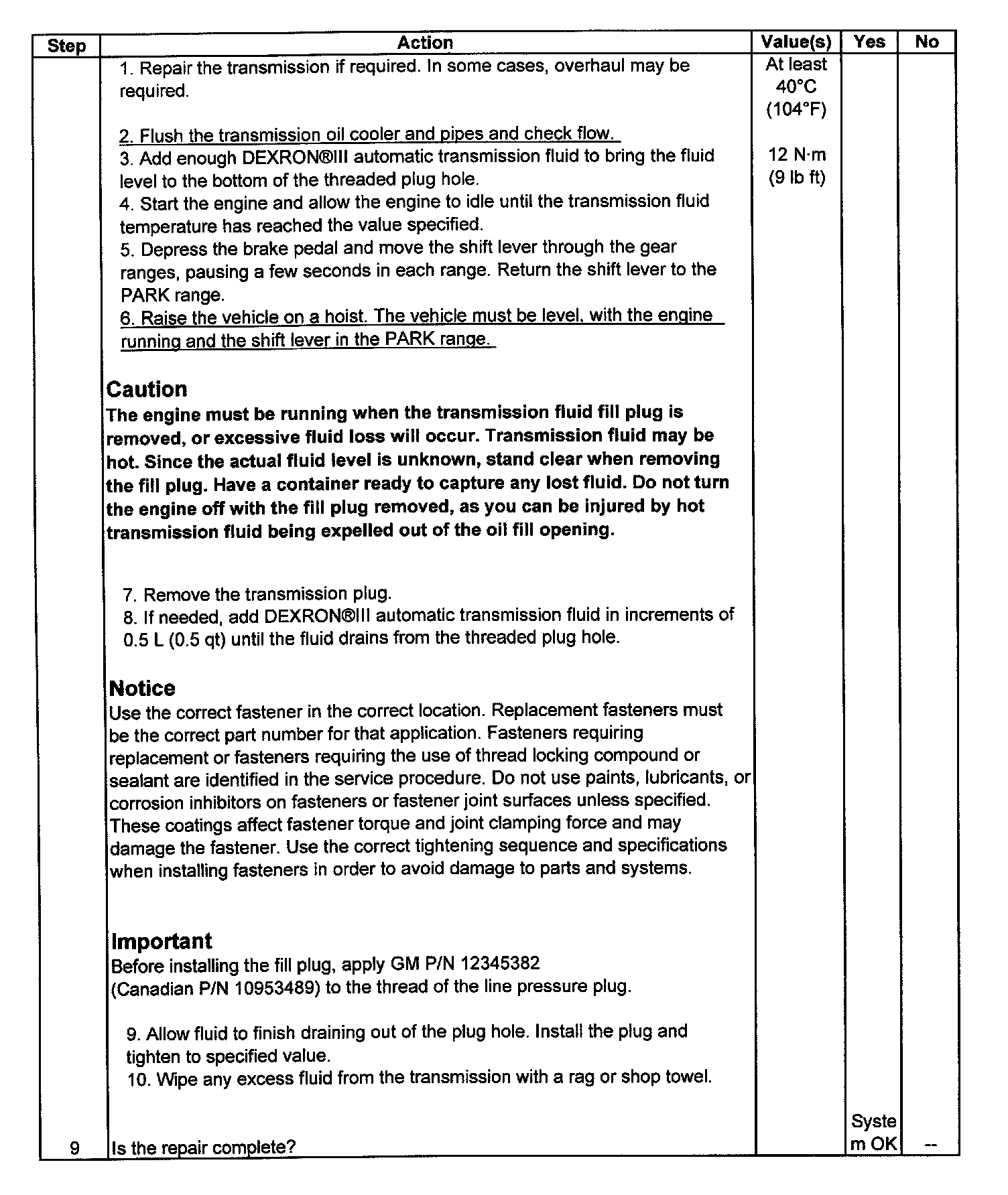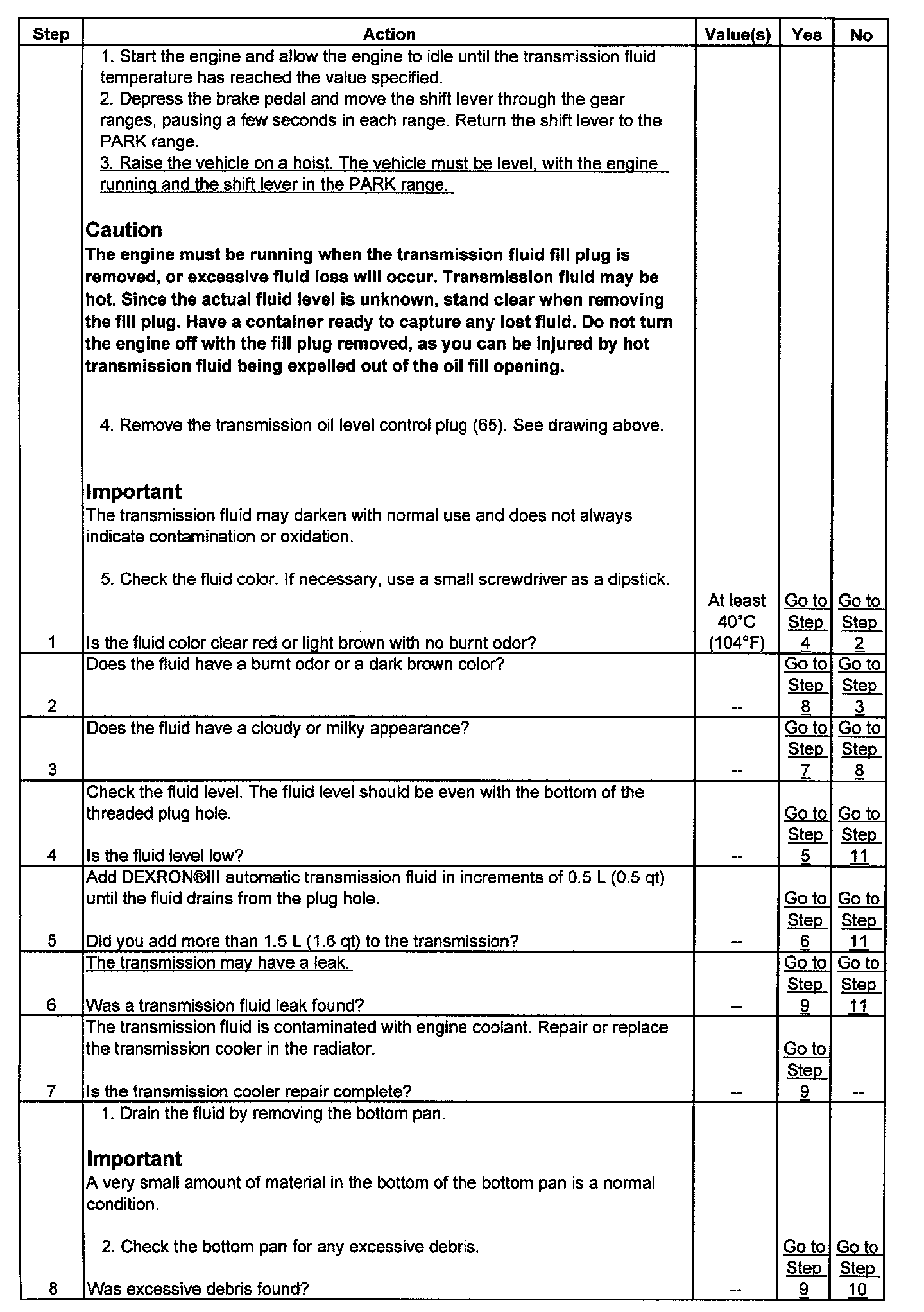 Caution When Checking Hot Transmission Fluid through Drain Plug HoleThe engine must be running when the transmission fluid fill plug is removed, or excessive fluid loss will occur. Transmission fluid may be hot. Since the actual fluid level is unknown, stand clear when removing the fill plug. Have a container ready to capture any lost fluid. Do not turn the engine off with the fill plug removed, as you can be injured by hot transmission fluid being expelled out of the oil fill opening.