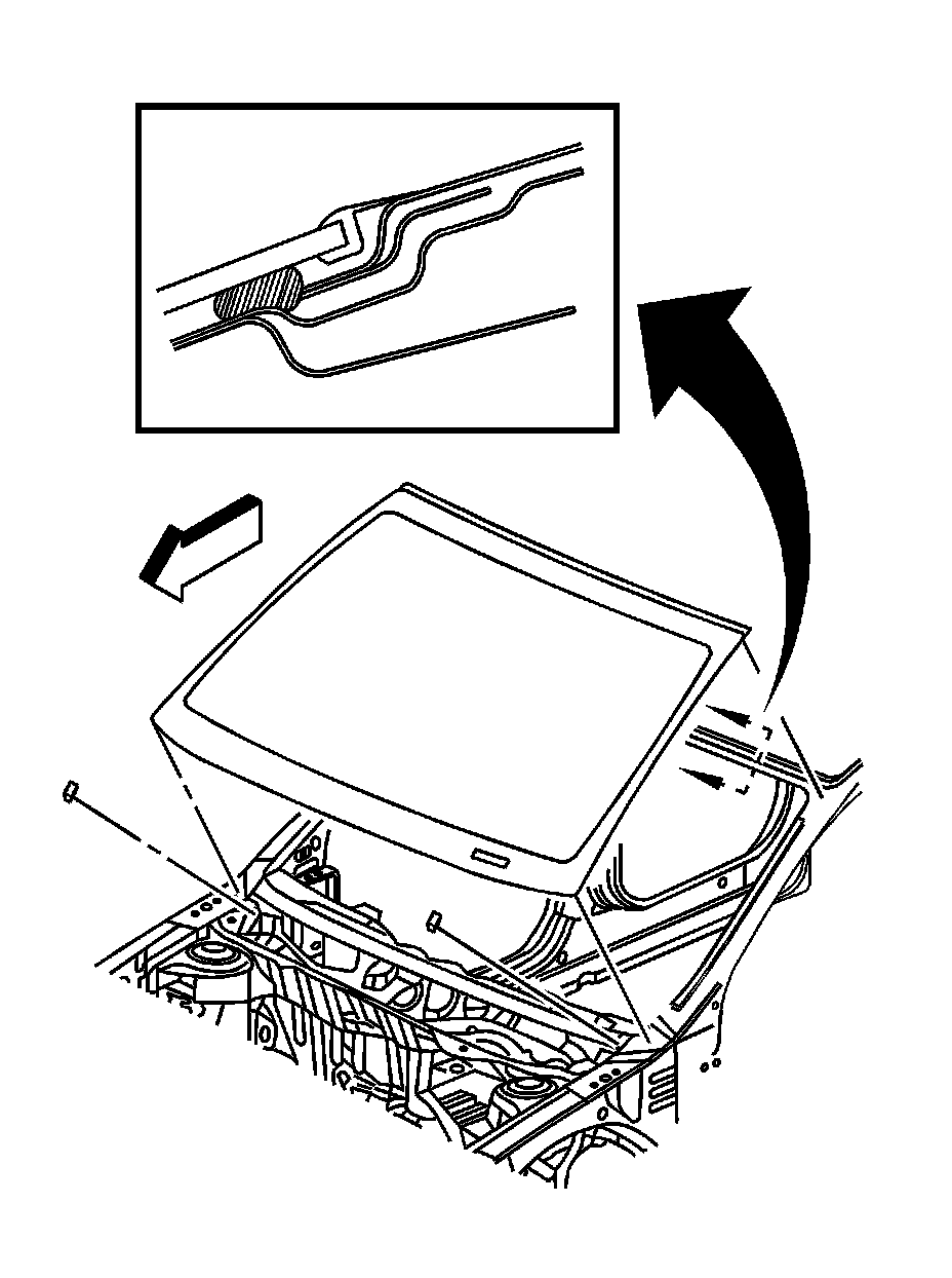 1. Install a stationary window into the opening. Refer to Urethane Adhesive Installation of Stationary Windows (Windshield) (Urethane Adhesive Installation of Stationary Windows (Windshield))Urethane Adhesive Installation of Stationary Windows (Back Window) (Procedures).