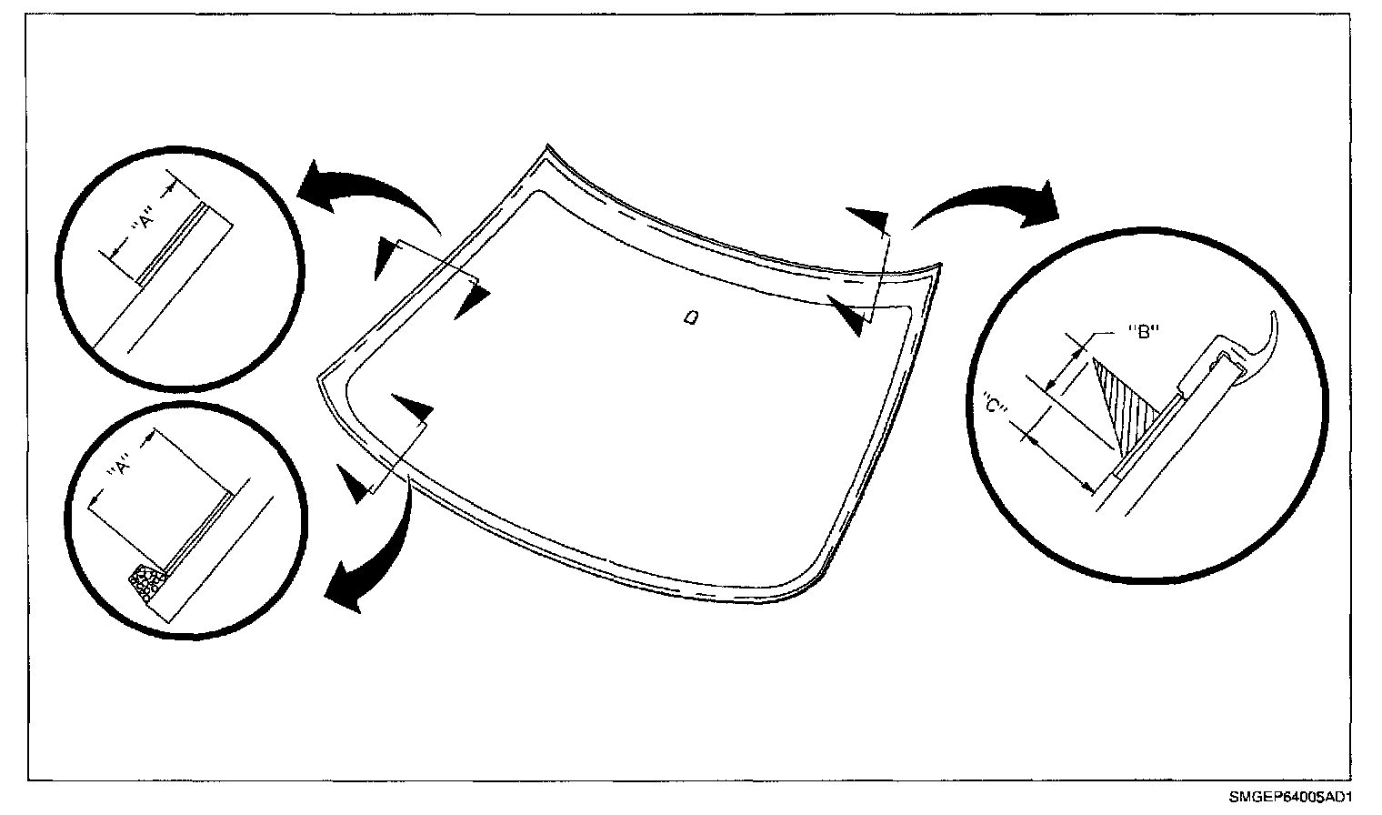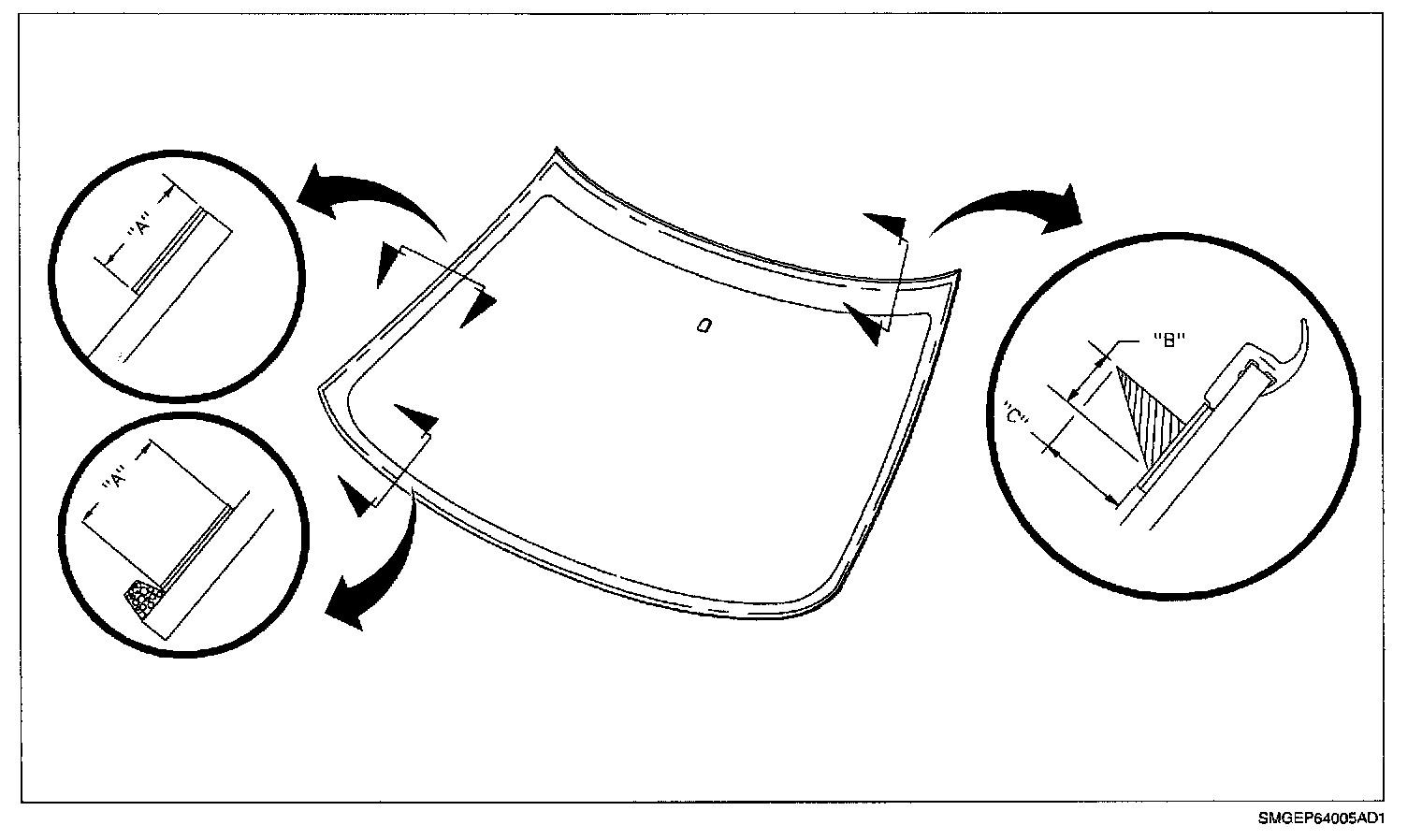 10. Apply a smooth bead of urethane directly to the old urethane adhesive in the pinchweld area on the body or to the glass. Apply according to the dimensions below: