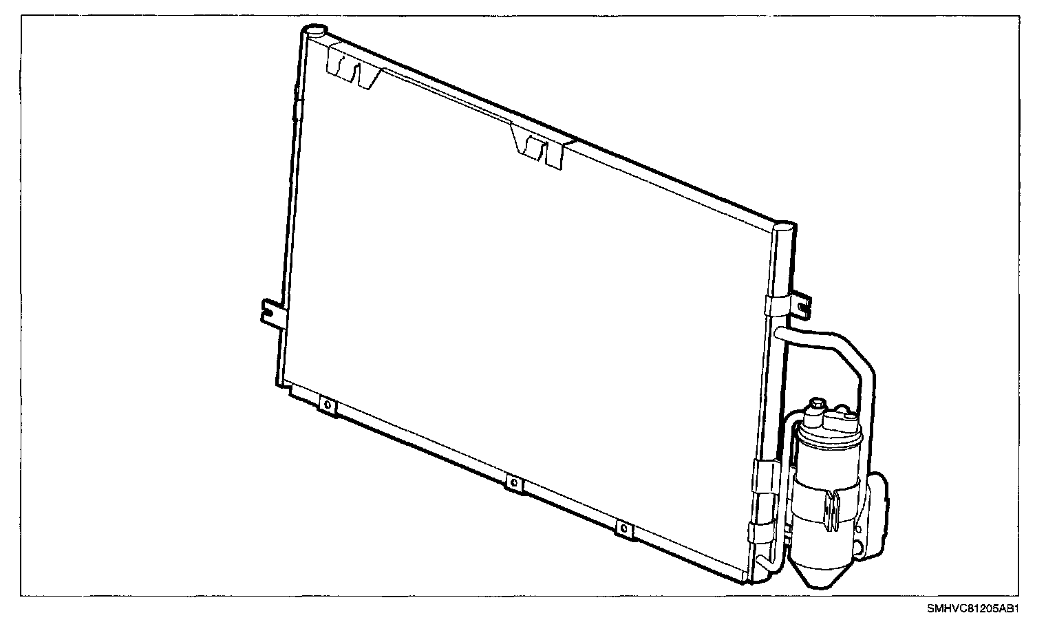 The condenser is located forward of and is mounted to the radiator. The condenser design is similar to that of a radiator with a multiple tube cross flow pattern. The condenser transfers heat from the high temperature refrigerant gas to the air, causing the refrigerant to condense into a liquid. This condensed refrigerant then flows out to the receiver/dehydrator assembly. The cooling capacity of the condenser will be diminished if the condenser fins are not kept clean and straight.
