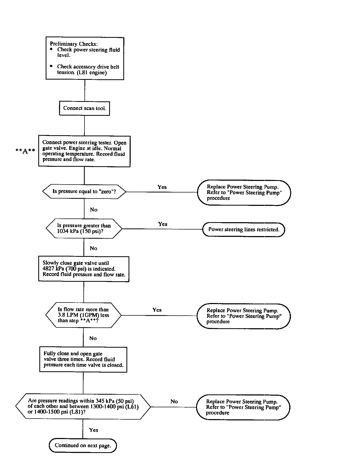 IMPORTANT: Do not turn steering wheel while performing this test. This will lead to inaccurate results. Record the power steering fluid pressure each time gate valve is closed. All three readings should be within 345 kPa (50 psi) of each other and between 1300 - 1400 psi (L61) or 1400 - 1500 psi (L81). If not, replace pump.
