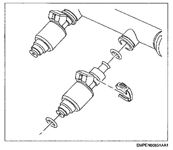 NOTE: Use care in removing fuel injectors to prevent damage to electrical connector pins on fuel injector and nozzle. The fuel injector is serviced as a complete assembly only. Since it is an electrical component, it should not be immersed in any type of cleaner. Support fuel rail to avoid damaging other components while removing fuel injector.