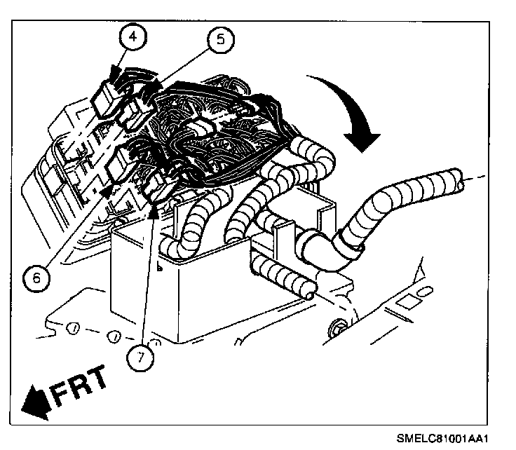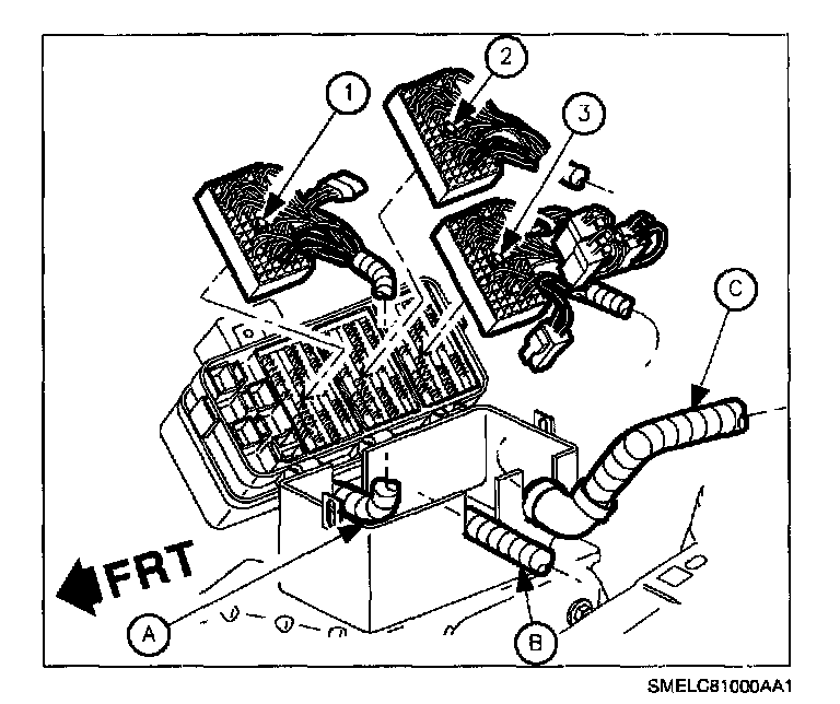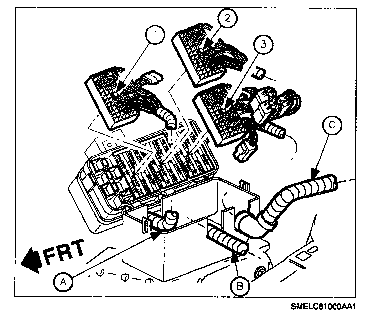 13. Remove routed harnesses. (Engine (A), Forward Lamp (B), and I/P (C).)