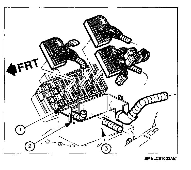 10. Push in tabs (3) on the end of the fuse block case and roll back the fuse block (1).