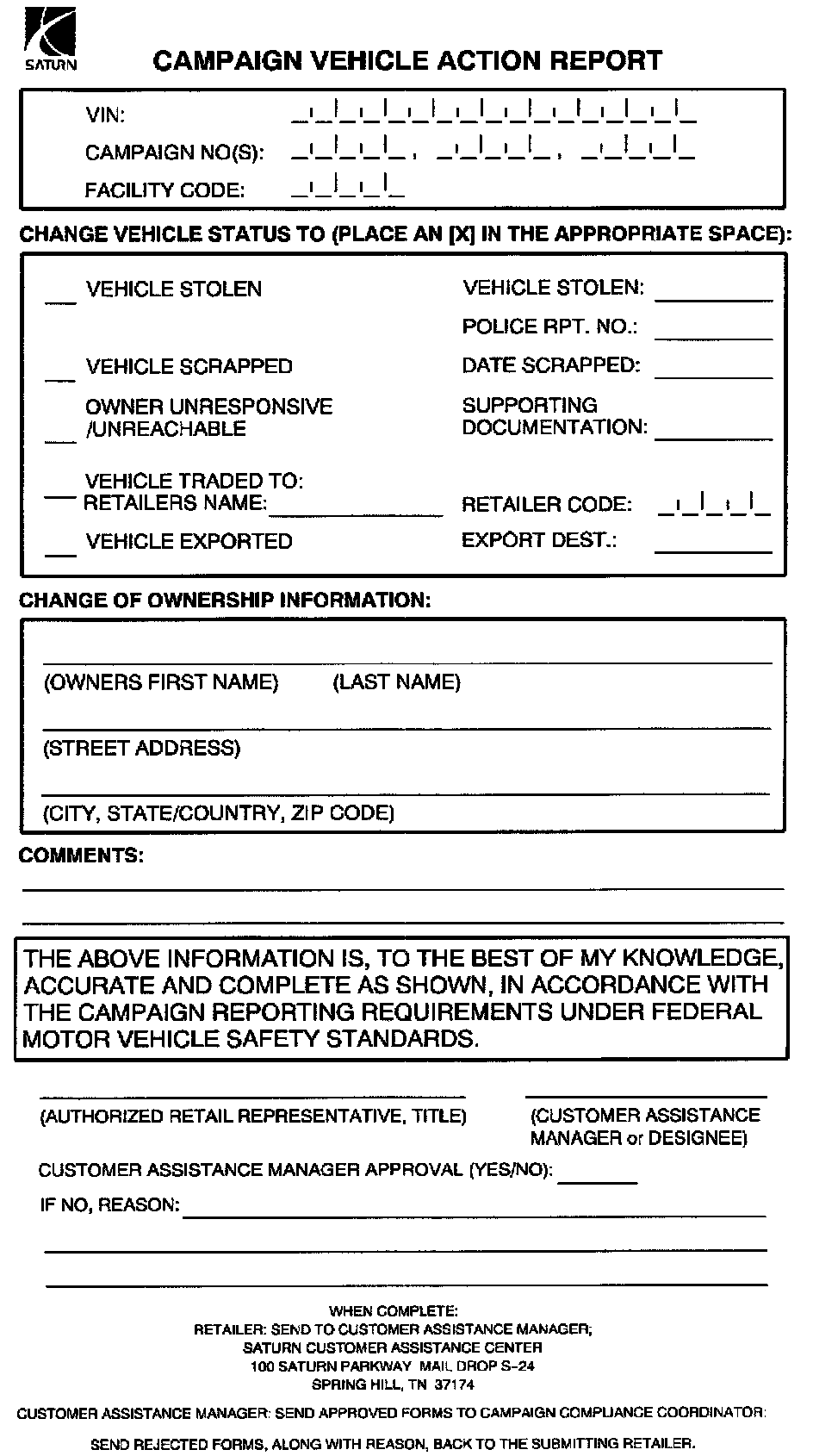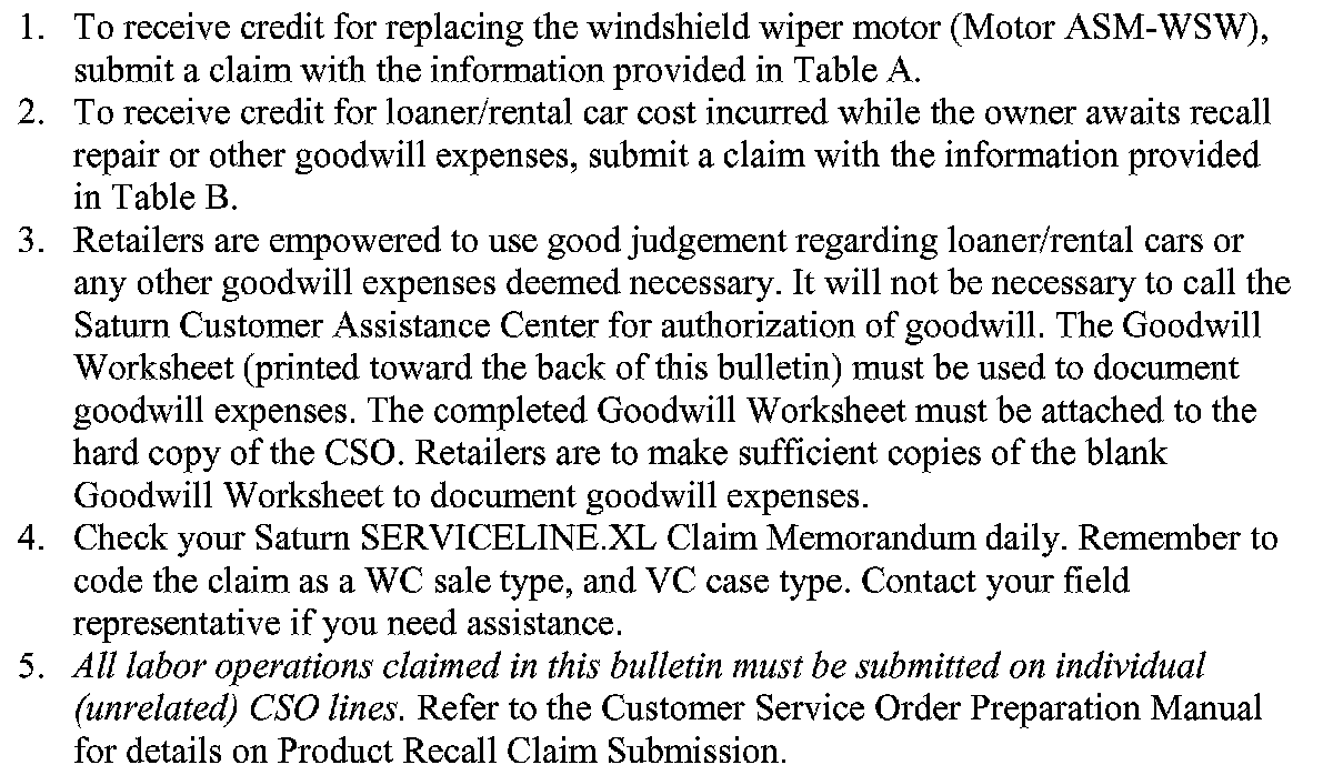 ^ Submit a Campaign Vehicle Action Report as shown to your Customer Assistance Manager (CAM) at the Saturn Customer Assistance Center.