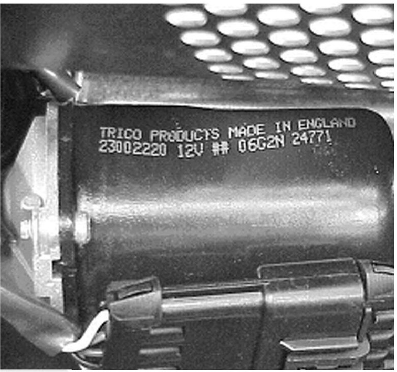 ^ If wiper motor label indicates motor was made in England, as shown, replacement of wiper motor is not required. Secure cowl grill and reinstall front of dash weatherstrip. Affix Recall Identification Label on a clean and dry surface of radiator core support, in an area clearly visible when hood is raised. (For more information, refer to "RECALL IDENTIFICATION LABEL" in this bulletin.)