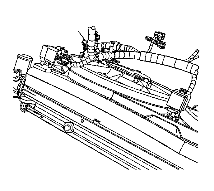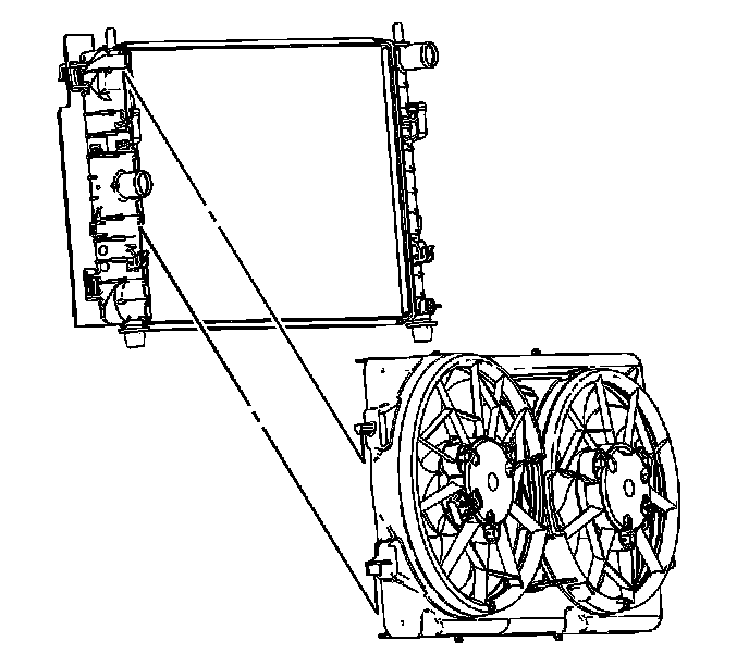 10. Align the cooling fan shroud retaining features to the radiator. Pull down on the cooling fan assembly to snap the shroud onto the radiator.