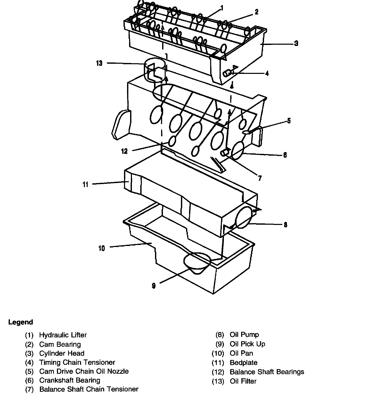 Oil is applied under pressure to the crankshaft, connecting rods, balance shaft assembly, camshaft bearing surfaces, valve lifters and timing chain hydraulic tensioner. All other moving parts are lubricated by gravity flow or splash. Oil enters the gerotor type oil pump thorough a fixed inlet screen. The oil pump is driven by the crankshaft. The oil pump body is within the engine front cover. The pressurized oil from the pump passes through the oil filter. The oil filter is located on the right (front) side of the engine block. The oil filter is housed in a casting that is integrated with the engine block. The oil filter is a disposable cartridge type. A by-pass valve in the filter cap allows continuous oil flow in case the oil filter should become restricted. Oil then enters the gallery where it is distributed to the balance shafts, crankshaft, camshafts and camshaft timing chain oiler nozzle. The connecting rod bearings are oiled by constant oil flow passages through the crankshaft connecting the main journals to the rod journals. A groove around each upper main bearing furnishes oil to the drilled crankshaft passages. The pressurized oil passes through the cylinder head restrictor orifice into the cylinder head and then into each camshaft feed gallery. Cast passages feed each hydraulic element adjuster and drilled passages feed each camshaft bearing surface. An engine oil pressure switch or sensor is installed at the end. Oil returns to the oil pan through passages cast into the cylinder head. The timing chain lubrication drains directly into the oil pan.