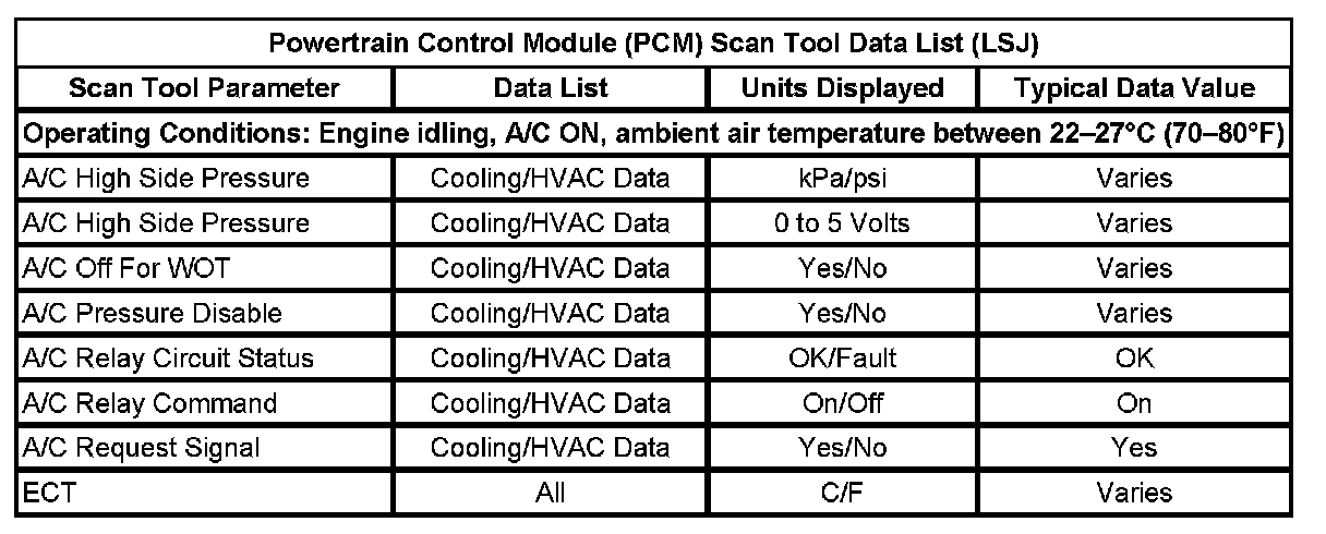 Powertrain Control Module (PCM) Scan Tool Data List: