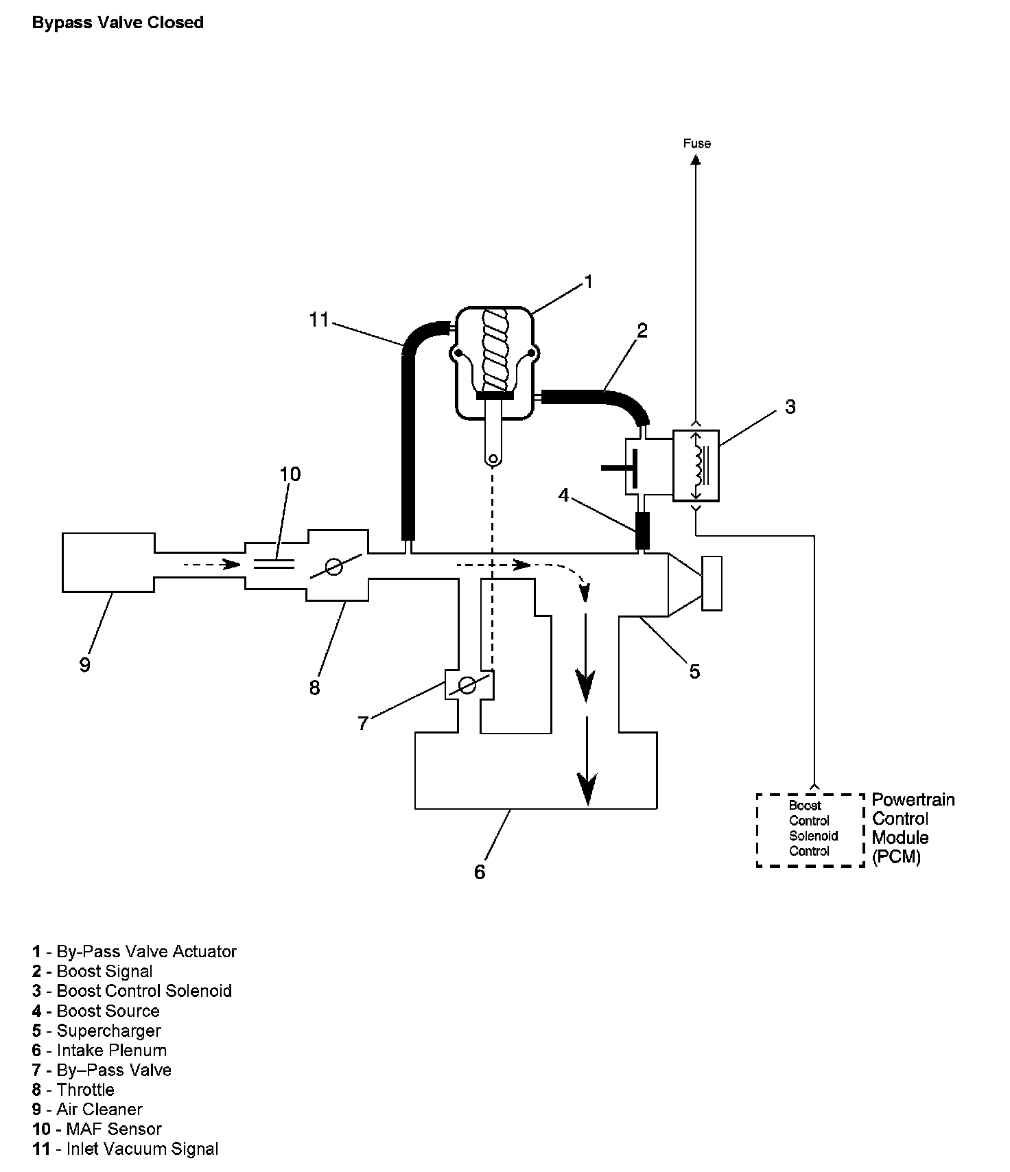 The PCM controls boost pressure by using the boost control solenoid. The boost control solenoid is normally an open valve. Under most conditions, the PCM commands the boost control solenoid to operate at a 100 percent duty cycle. This keeps the solenoid valve closed and allows only inlet vacuum to control the position of the bypass valve. At idle, engine vacuum is applied to the upper side of the bypass valve actuator, counteracting spring tension to hold the bypass valve open. As engine load is increased, engine vacuum is decreased, causing the spring in the bypass valve actuator to overcome the applied vacuum, closing the bypass valve and allowing the boost pressure to increase. The bypass valve starts to close when the vacuum measures 250 mm Hg (10 in Hg) and is fully closed at 90 mm Hg (3.5 in Hg). When reduced boost pressure is desired, the PCM commands the boost control solenoid to operate at a 0 percent duty cycle. This opens the solenoid valve and allows boost pressure to enter the bypass valve actuator at the lower side to counteract the spring tension, opening the bypass valve and recirculating excess boost pressure back into the supercharger inlet.