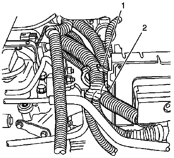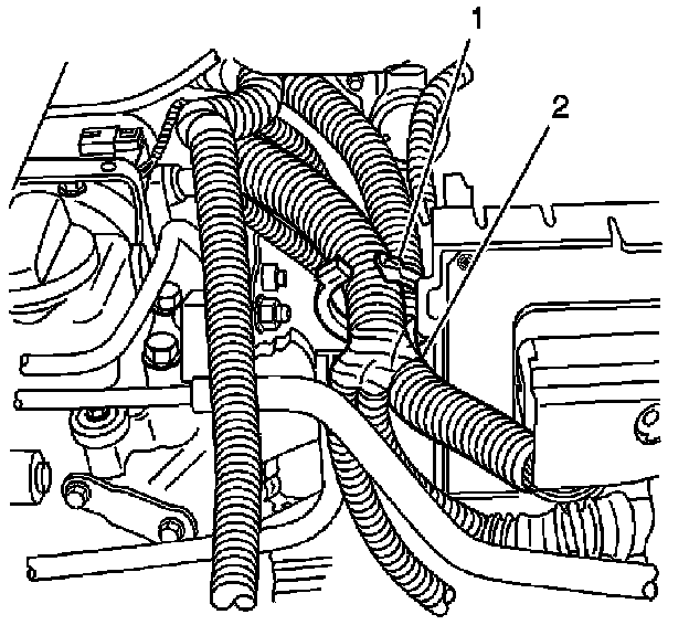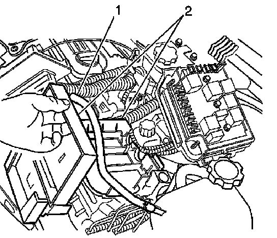 F. Release the engine wiring harness retainer (1), next to the powertrain control module (PCM). Reposition the wiring harness (2) toward the engine.
