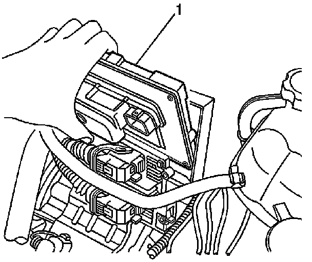 I. Install the engine wiring harness (2) to the retainer (1), next to the PCM. Secure the harness retainer (1).