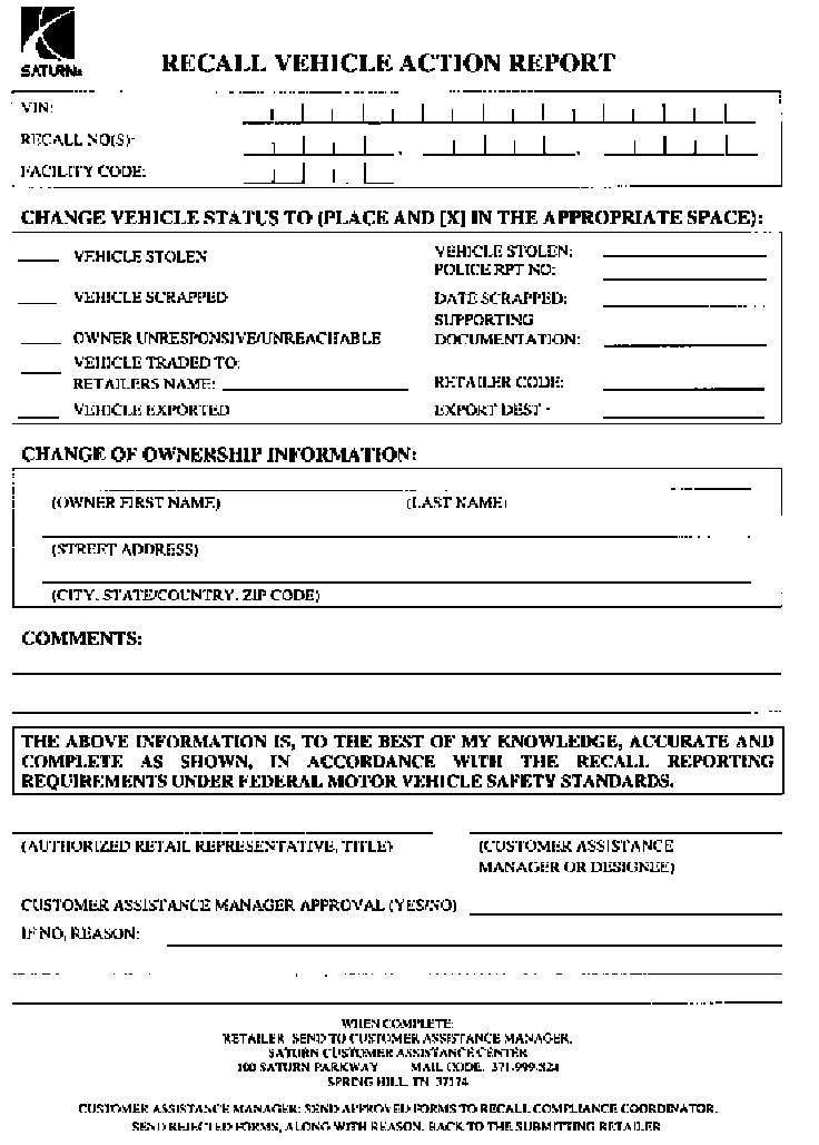 A copy of the Recall Vehicle Action Report is shown for your reference. Additional copies can be ordered from Saturn Publications. All changes to program responsibility will be reflected in your next Unfixed VIN Report.