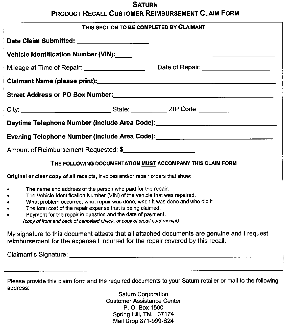 Submitting a recall reimbursement claim directly to your Saturn retailer may expedite processing; however, if you choose, you may file your claim through the Saturn Customer Assistance Center. Your claim will be acted upon within 60 days of receipt.