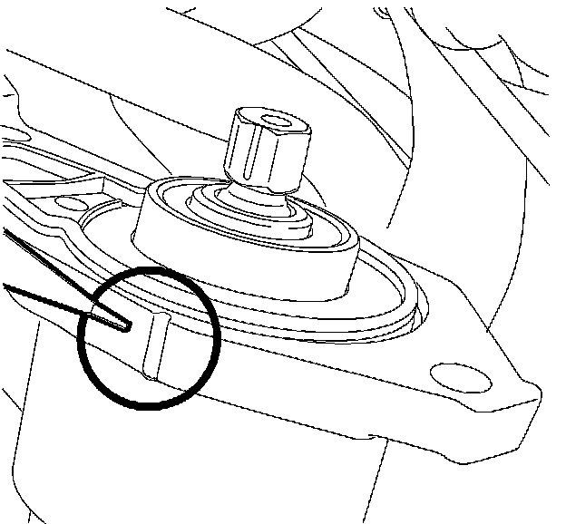 To determine # 4 cylinder TDC compression stroke, rotate the engine by the crankshaft pulley. A puff of air will be felt as the piston travels upward on the compression stroke. Once a puff of air is felt, continue to rotate the crankshaft pulley until the timing mark is aligned as shown in illustration.