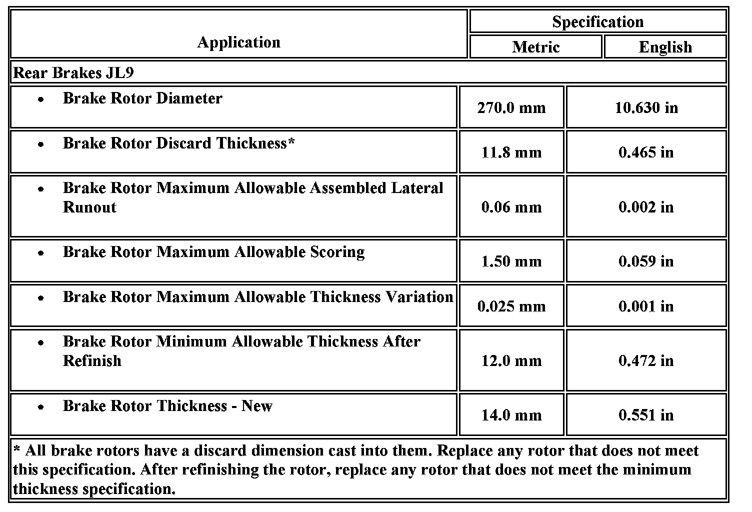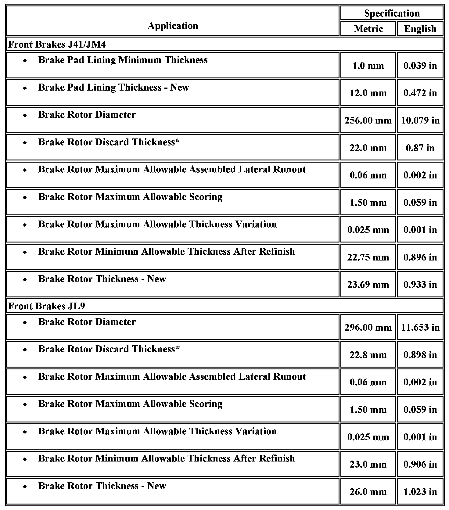 Disc Brake Component Specifications