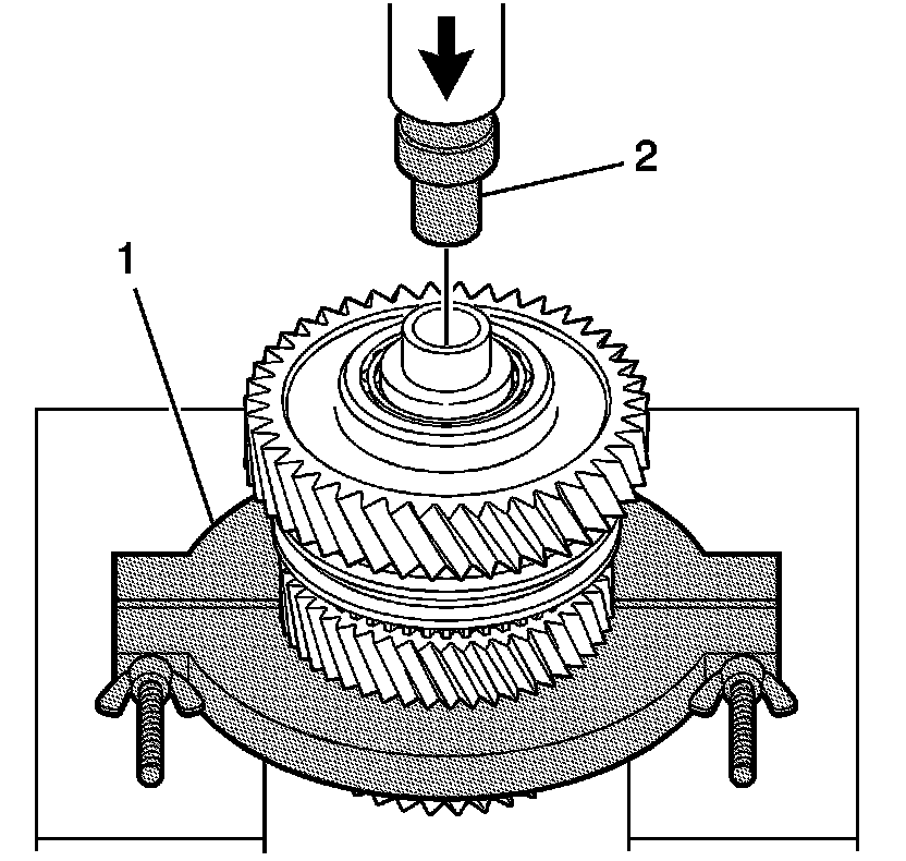 1. Press off the 1st gear assembly and the 2nd gear assembly as a unit, from the intermediate shaft using the J36513 (1), the J44383 (2) and a hydraulic press.