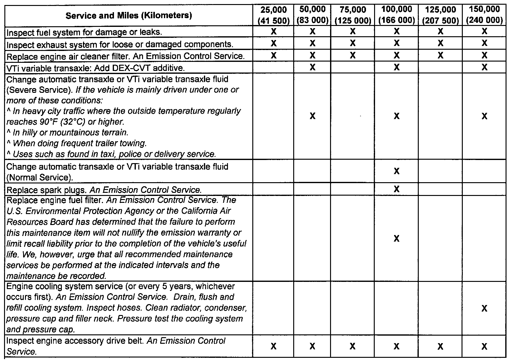 (Maintenance I or Maintenance II) after the indicated kilometers (miles) shown for each item.