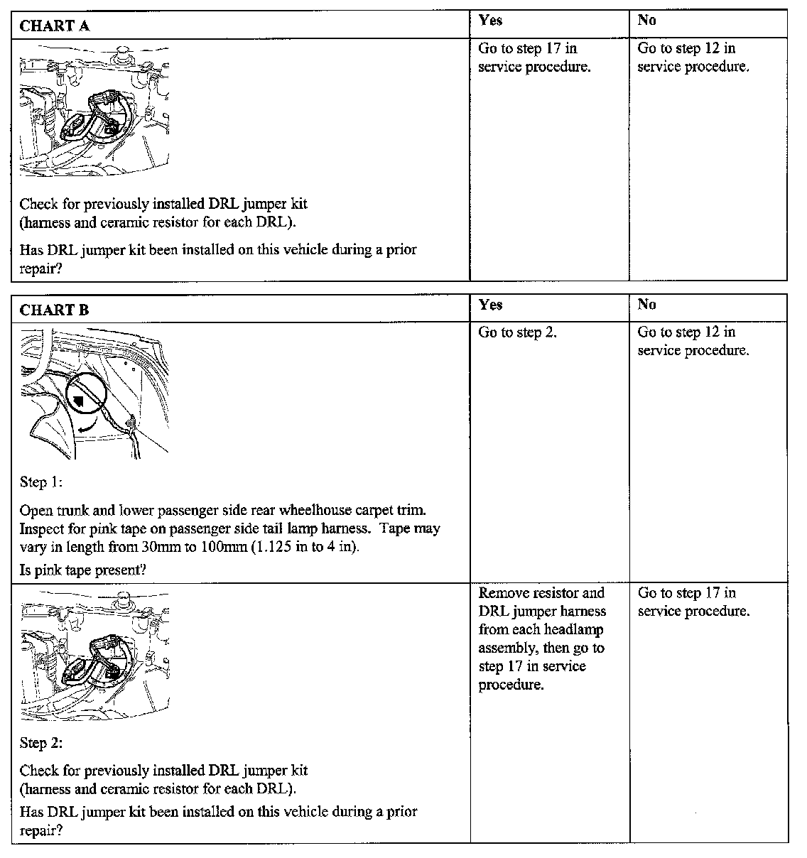 The charts shown will help determine if the vehicle needs the DRL jumper kit installed. Please note the VIN ranges associated with the two charts. Some vehicles produced afier VIN 4Z160000 have already had the resistance added to the turn signal circuit within the main body wiring harness. These main body wiring harnesses are identified with pink tape on the passenger side tail lamp harness in the trunk.