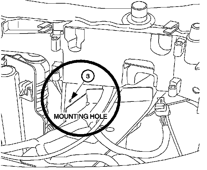 12. Locate mounting hole for resistor (3) on both the passenger and driver side. This hole is on the vertical metal between the radiator core support and the frame rail, just outboard of the radiator/condenser assembly. (Driver's side shown, passenger side in similar location.)