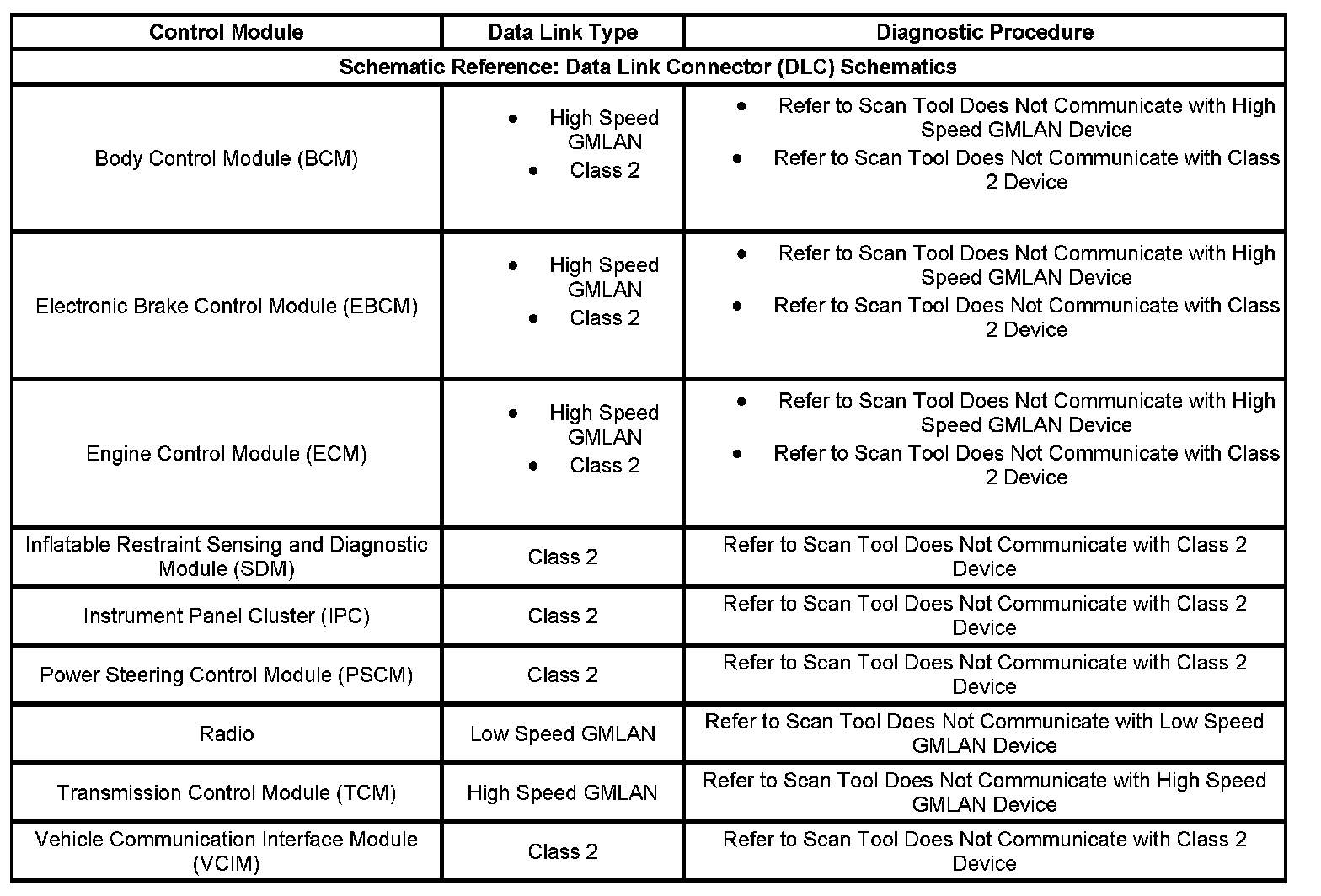 This table identifies which serial data link that a particular module uses for in-vehicle data transmission. Some modules may use more than one data link to communicate. Some modules may have multiple communication circuits passing through them without actively communicating on that data link. This table is used to assist in correcting a communication malfunction. For the description and operation of these serial data communication circuits refer to Data Link Communications Description and Operation