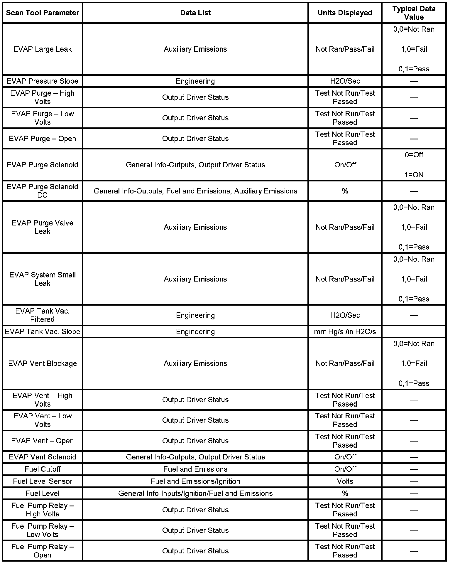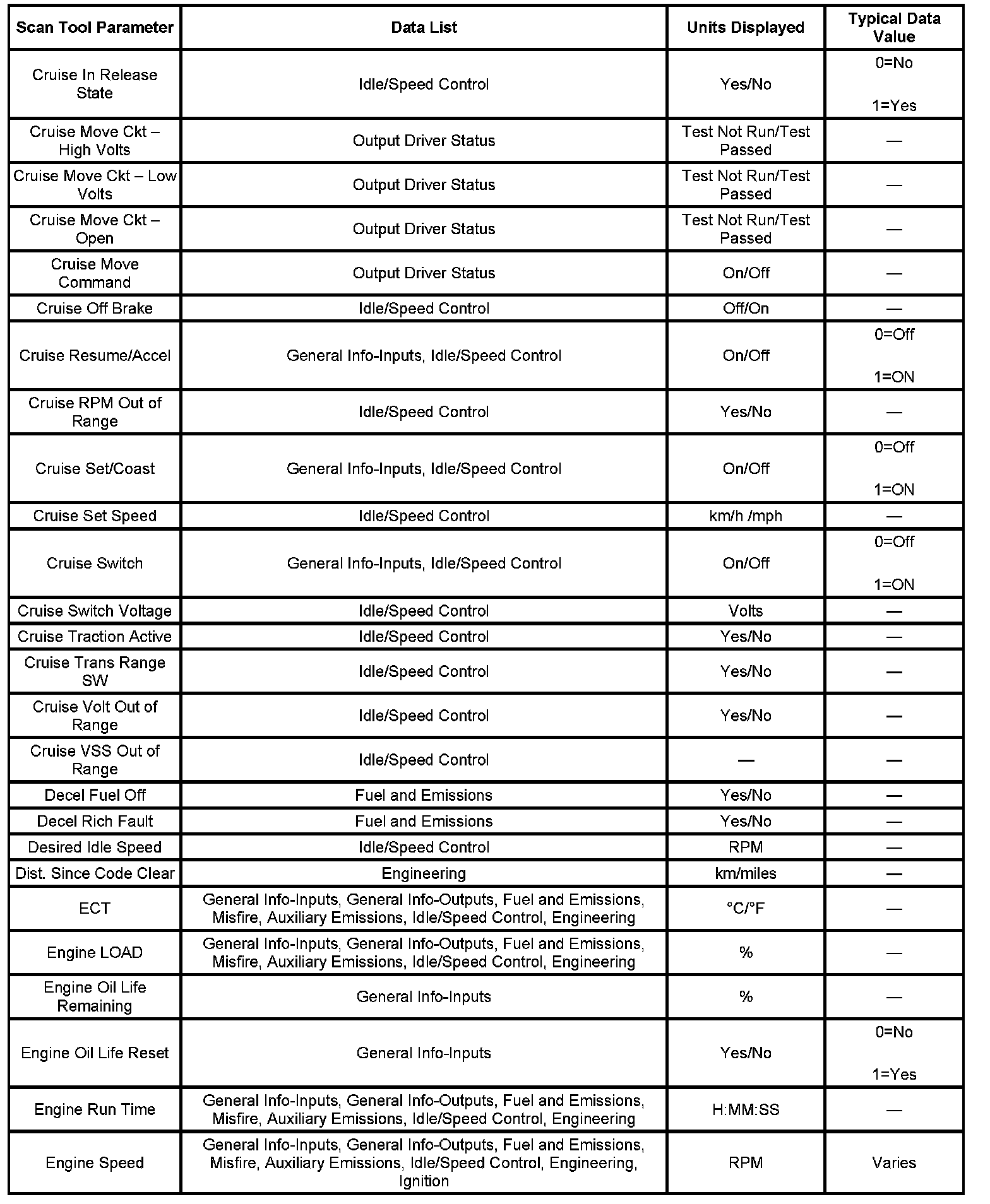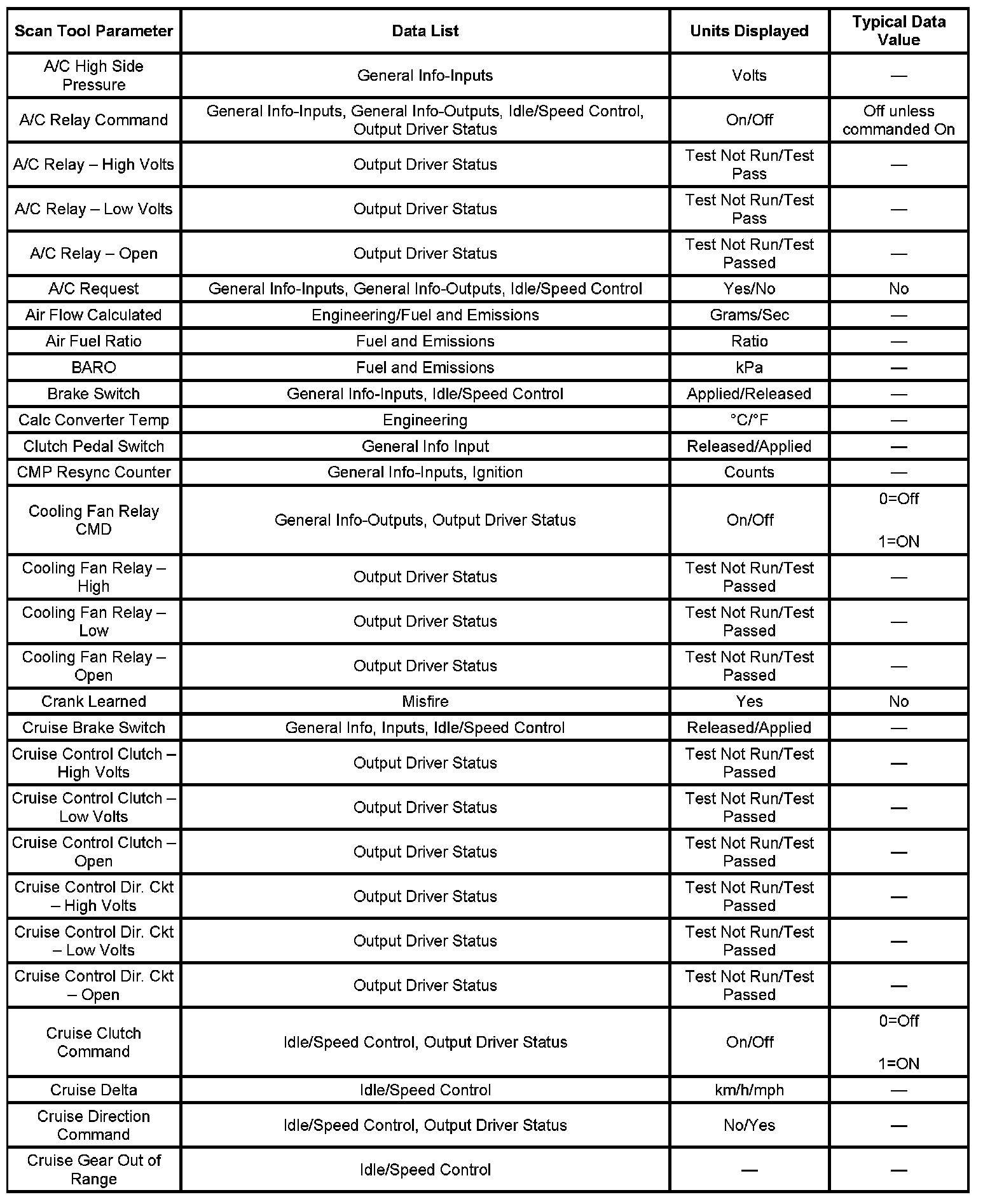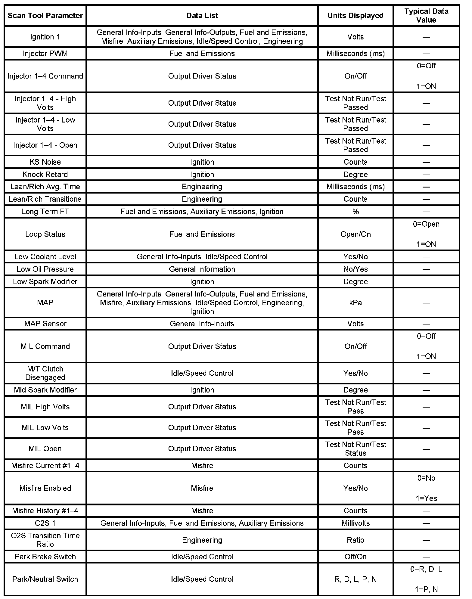 The engine Scan Tool Data List contains all engine related parameters that are available on the scan tool. The list is arranged in alphabetical order. The parameters in the Typical Scan Data values column represent values that would be seen on a normally running engine.